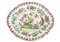 Vassoietto in porcellana policroma, Cina, dinastia Qing di forma ovale sagomata decorato in vivace policromia a motivi naturalistici; tesa a fiori e perimetro sottolineato da triangoli color corallo bordati in blu disposti in sequenza, cm 22,5x26