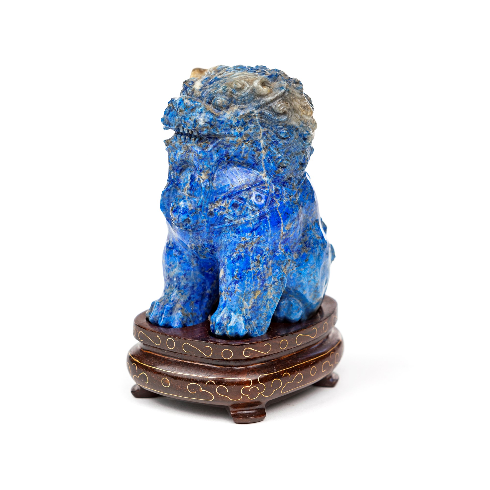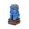 Intaglio in sodalite, arte cinese raffigurante leone buddista su base sagomata in legno decorata da inserto filiforme in metallo, altezza cm 8 - con la base cm 10,5