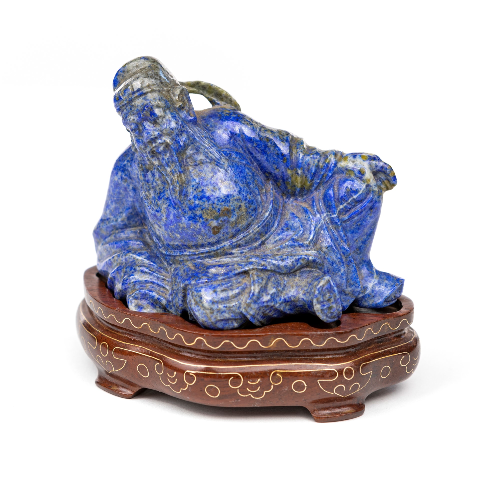 Intaglio in sodalite, arte cinese raffigurante il filosofo cinese Confucio; base sagomata in legno decorata da inserto filiforme in metallo , cm 6,5x9x6 - con la base cm 9x10x6,5