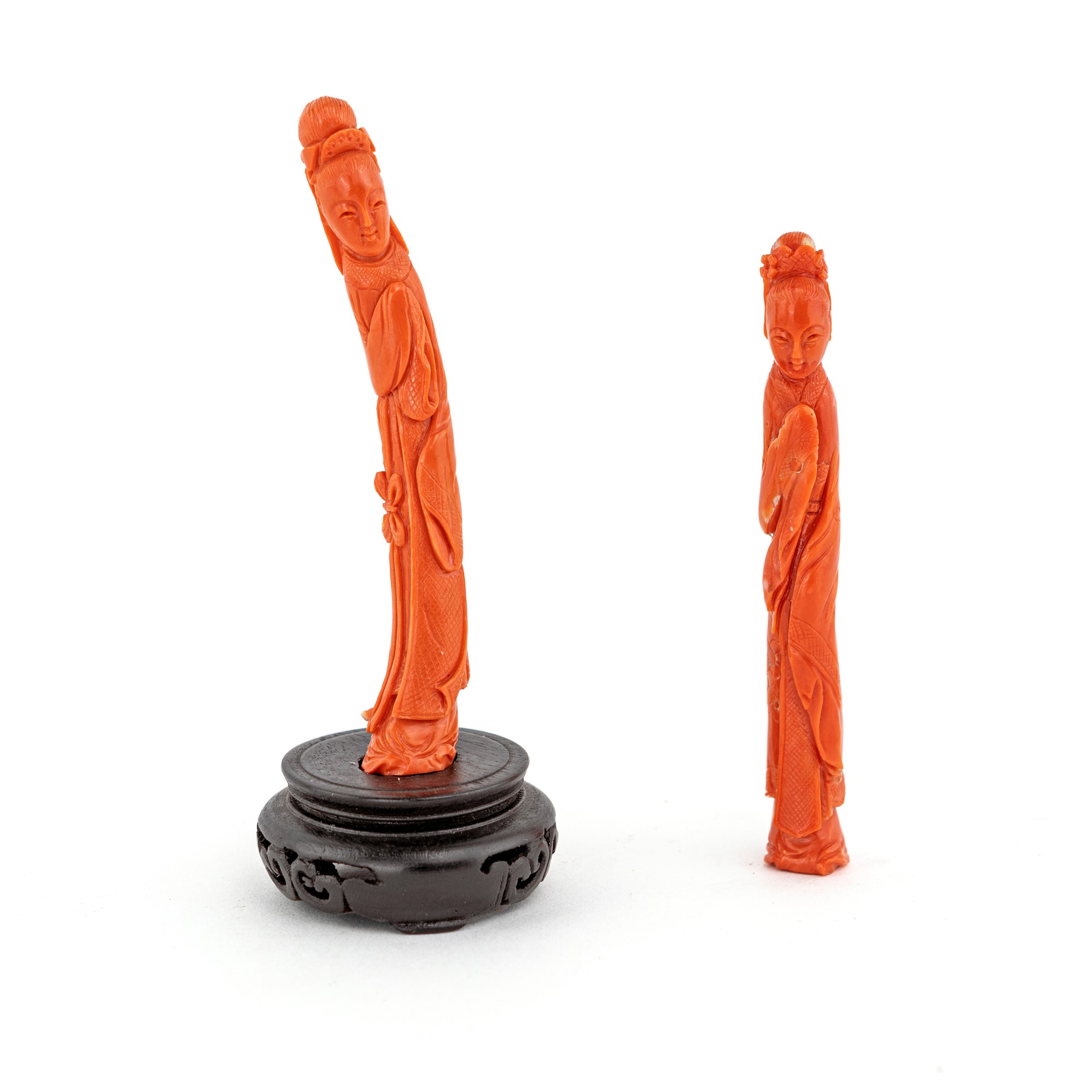 Due sculture in corallo cerasuolo, Cina, fine del XIX/inizi del XX secolo raffiguranti geishe, altezza cm 10,5 - gr. 58