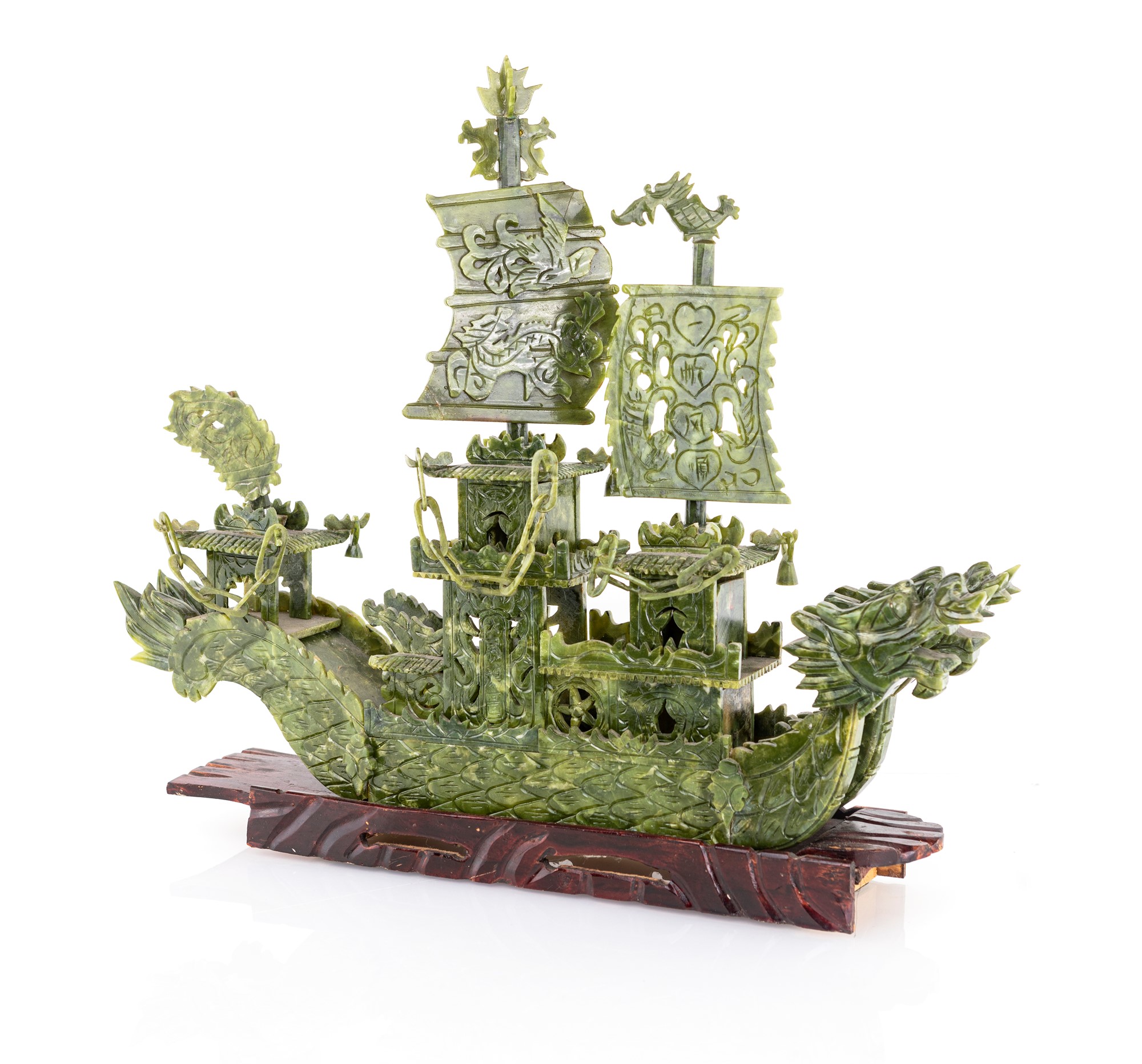 Vascello in giada, arte cinese del XX secolo con prua caratterizzata da due figure di drago e struttura decorata in bassorilievo con motivi ornamentali e simbolici; due vele estraibili sulla sommità e catene mobili impreziosiscono la struttura; base in legno , cm 48x60x10 - la base: cm 4x50x12