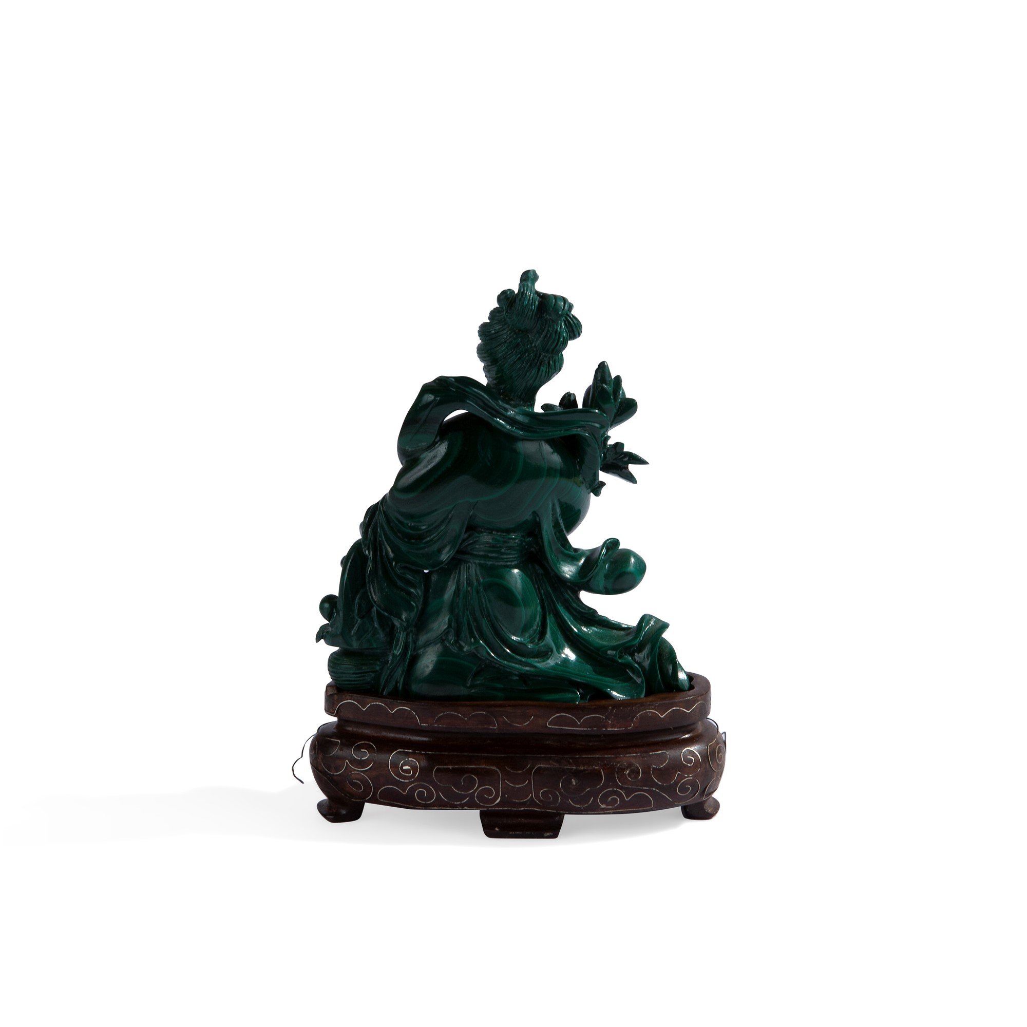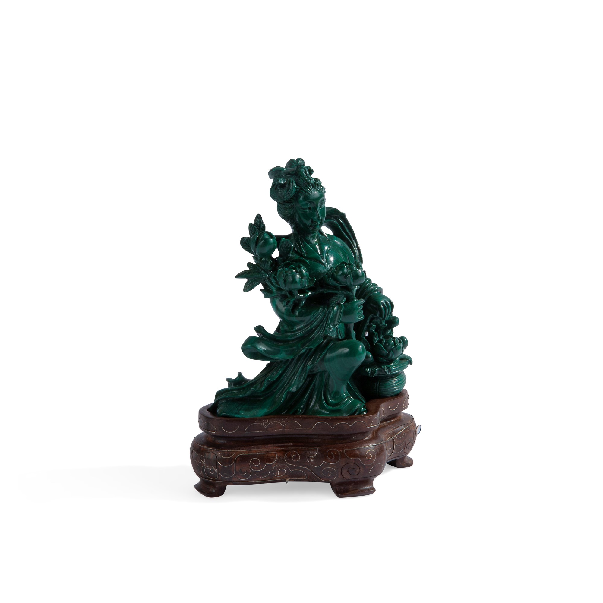 Intaglio in malachite, Cina, XX secolo raffigurante una geisha su base in legno impreziosita da inserti filiformi in metallo, cm 10x8,5x3,5 - con la base: cm 13x9,5x5