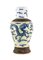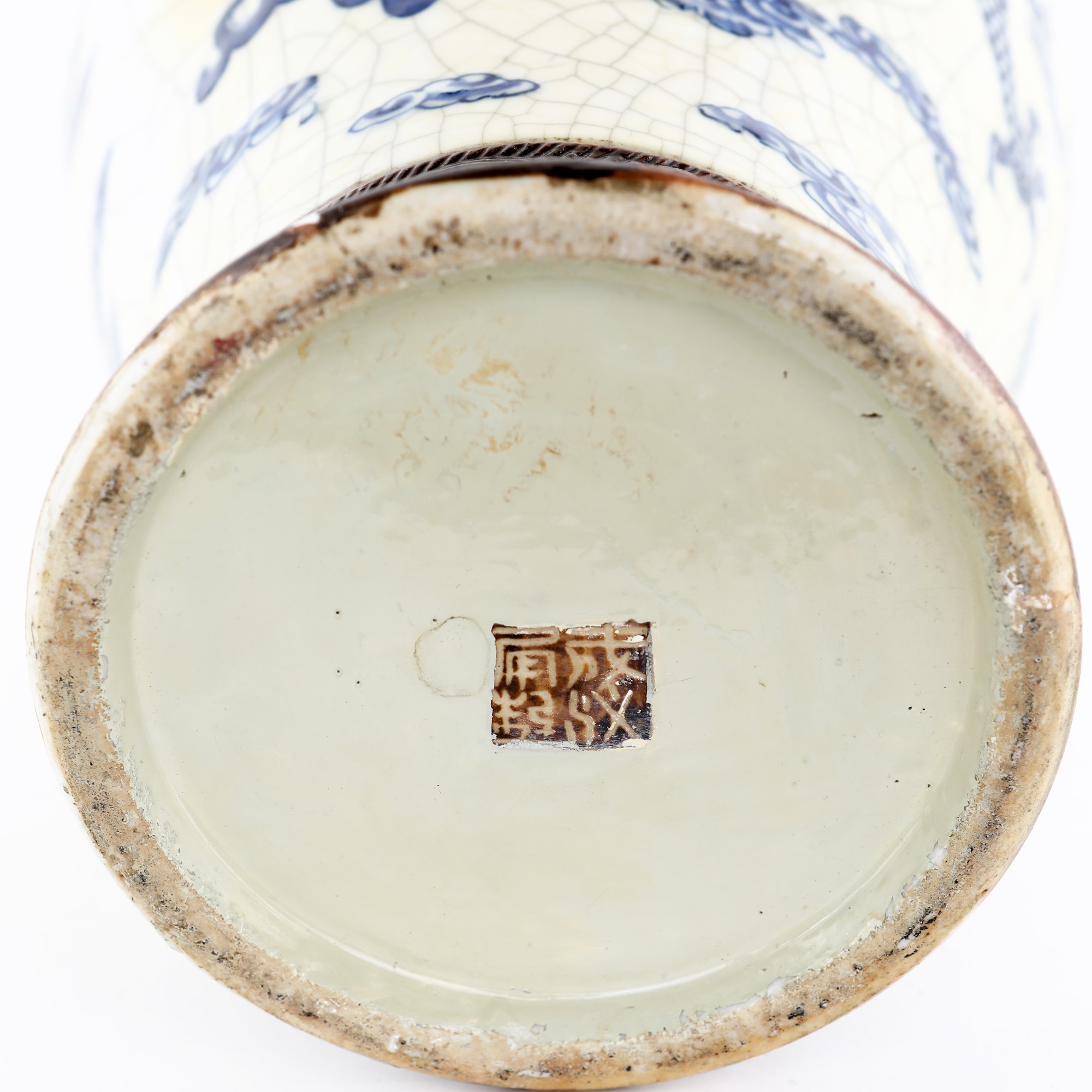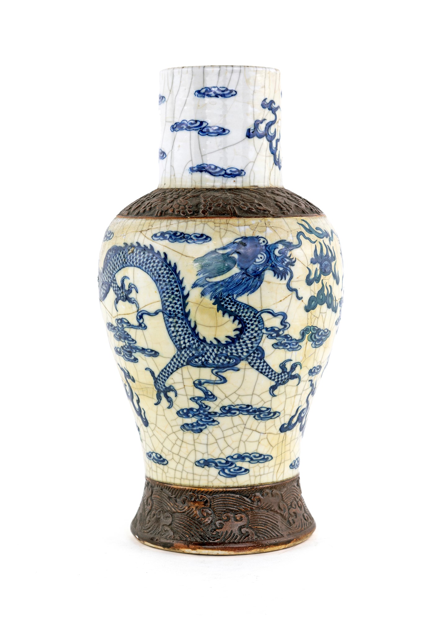 Vaso in porcellana, Cina, XX secolo decorato in blu su fondo craquelé con draghi affrontati; due fasce brunite con fitta ornamentazione in bassorilievo definiscono la base e il collo , altezza cm 41