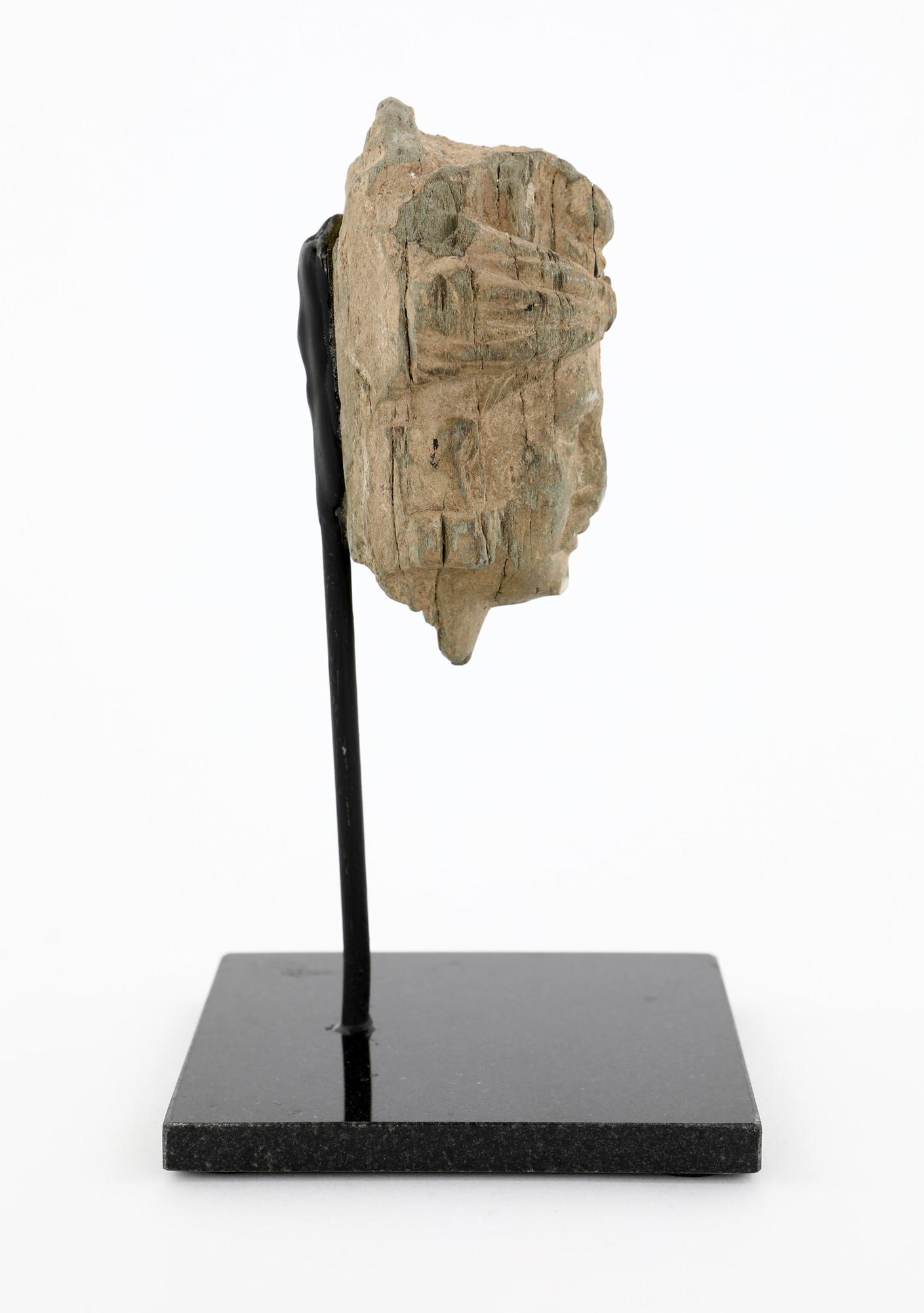 Antica piccola testa virile in arenaria con baffi e turbante, altezza cm 10