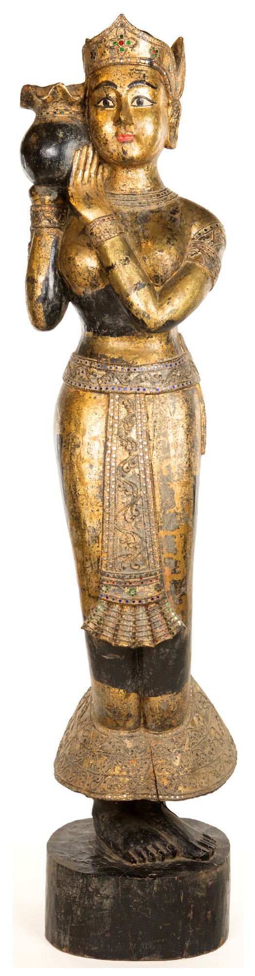 Grande figura femminile stante in legno laccato e dorato, Thailandia, prima metà del XX secolo