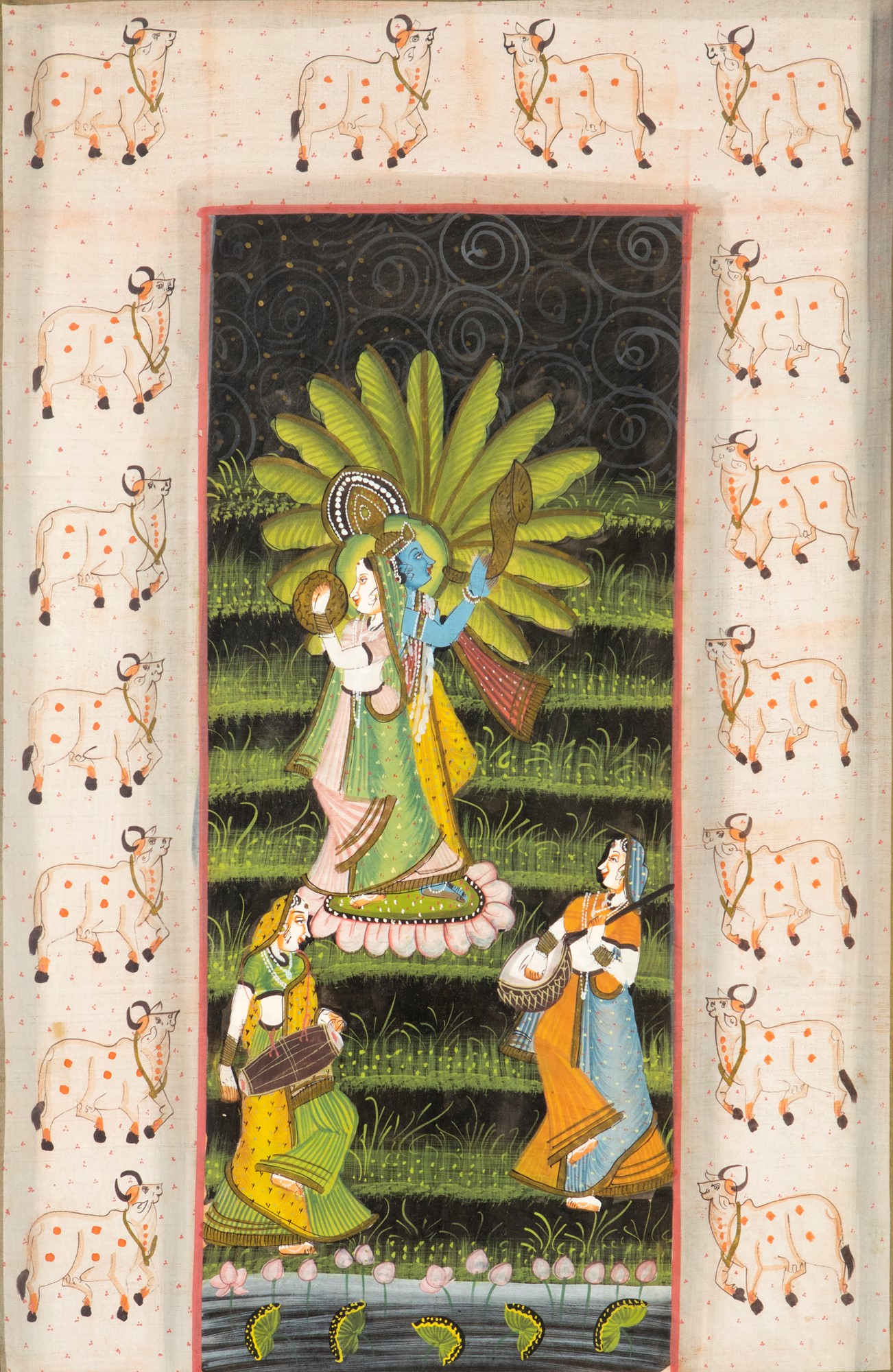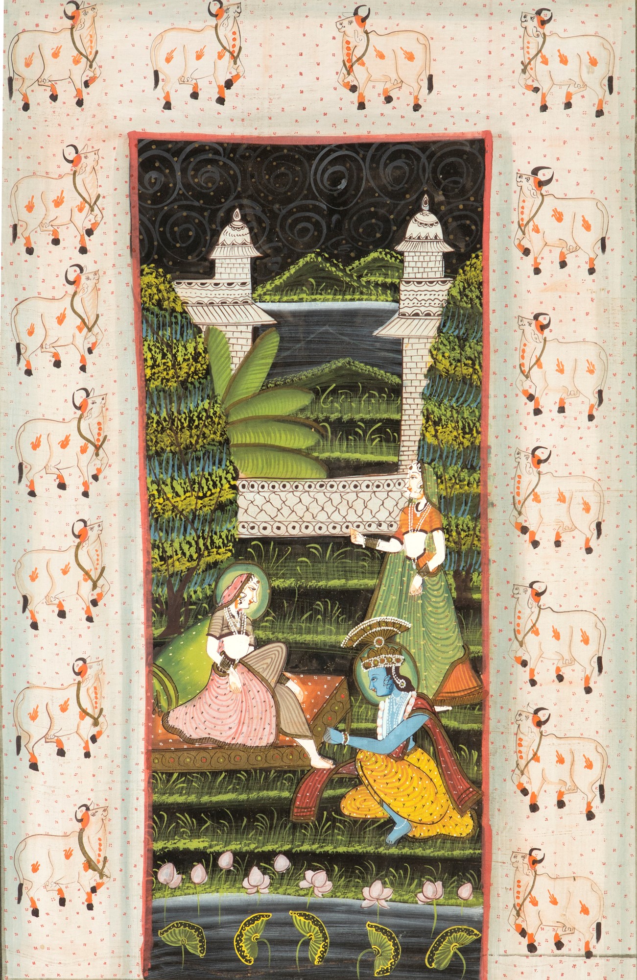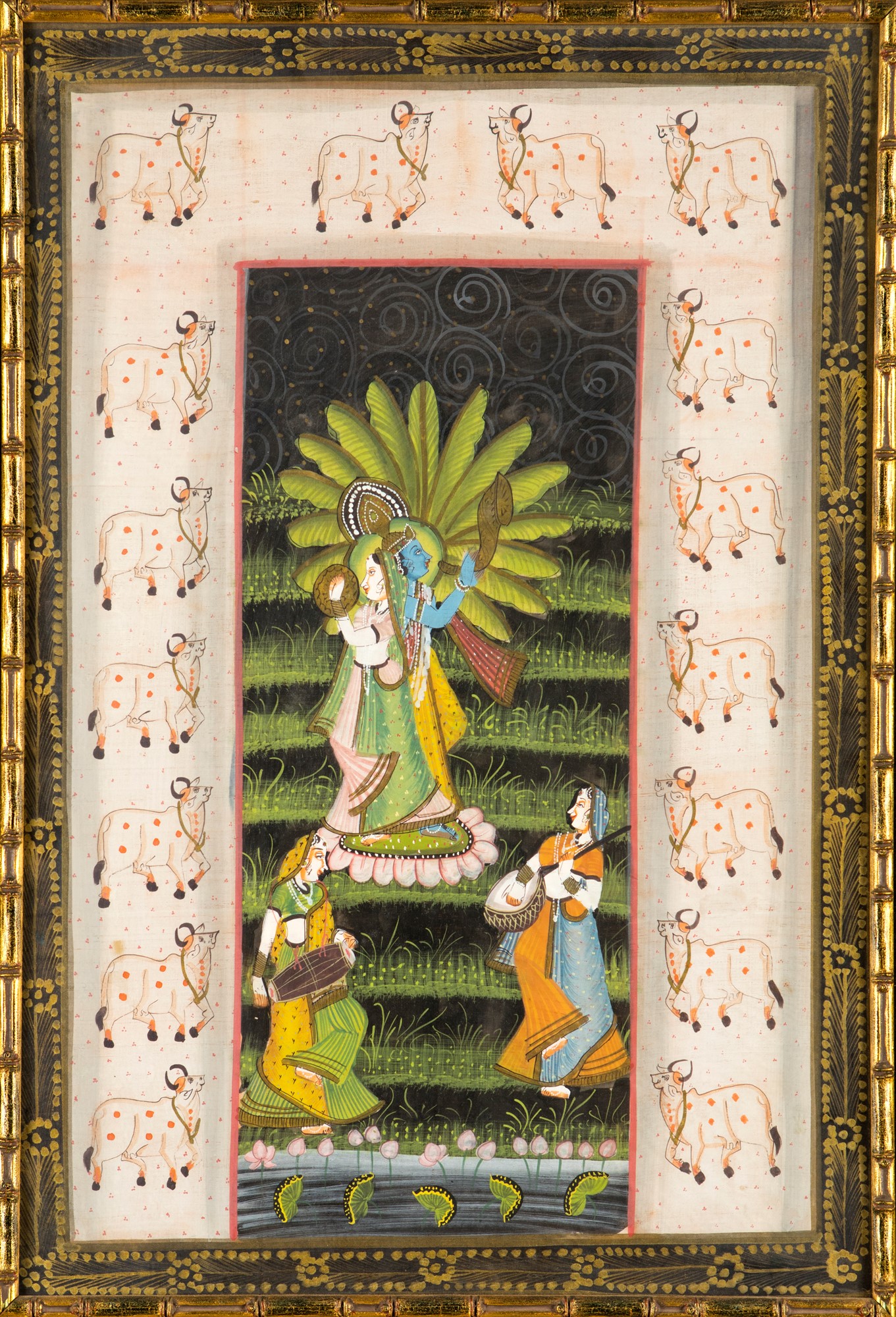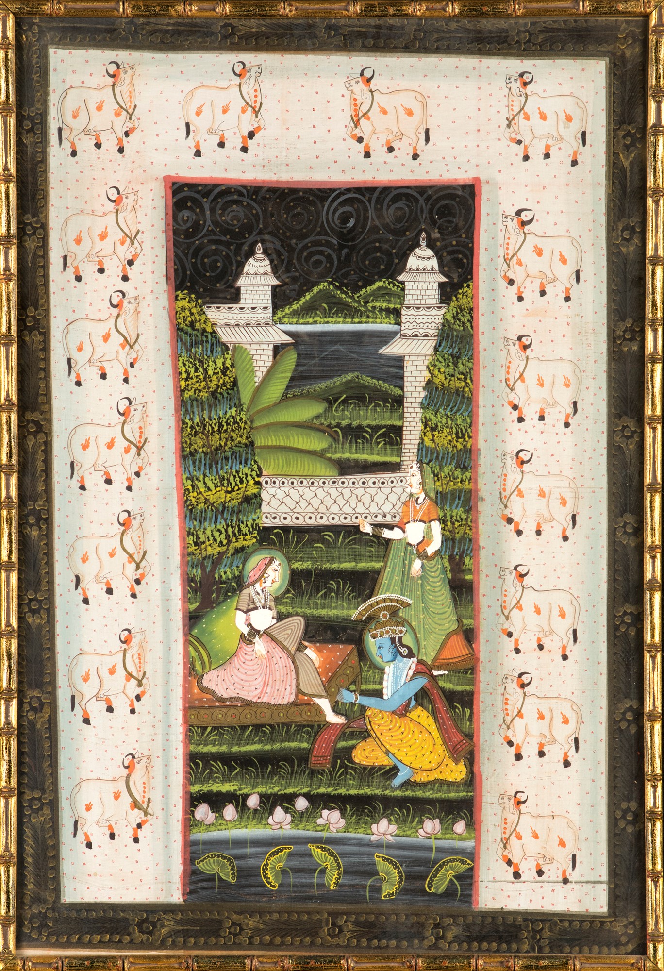 Coppia di dipinti su seta, India, XX secolo raffiguranti scene dal Mahabharata con Krishna, Gopi ed altri personaggi; cornici dorate a simulare canna di bambù, con la cornice: cm 65x45