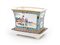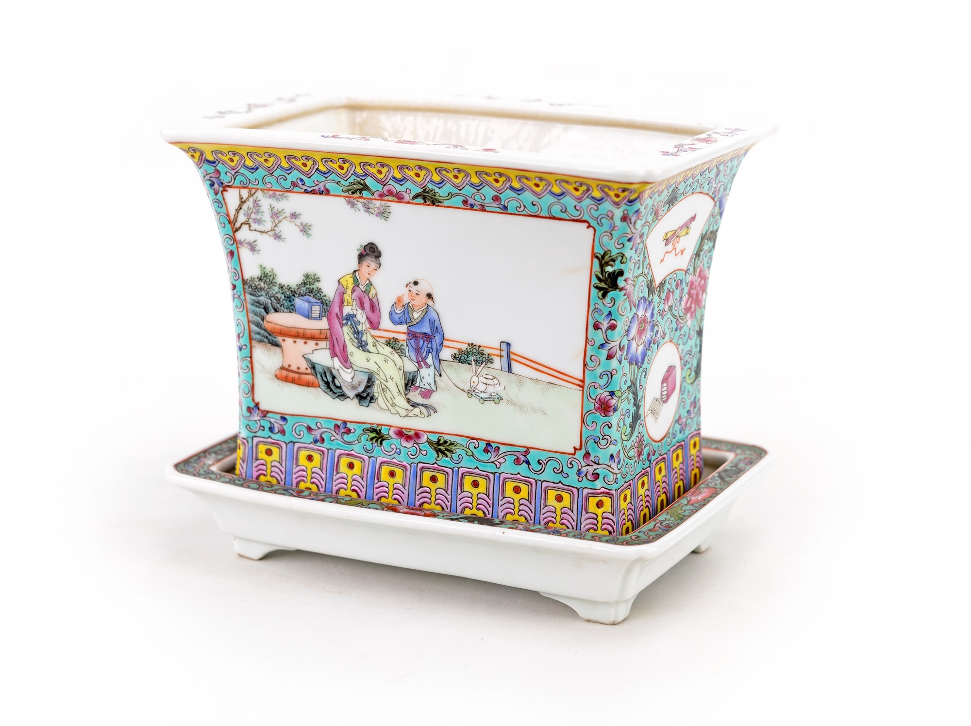 Fioriera da tavolo in porcellana con sottovaso, Repubblica Popolare Cinese di forma rettangolare, decorata da grandi scene di genere, scroll e scatole con pergamene entro riserve geometriche; fondo turchese con fitta decorazione a ramages e grandi peonie , cm 16,5x20x13,5