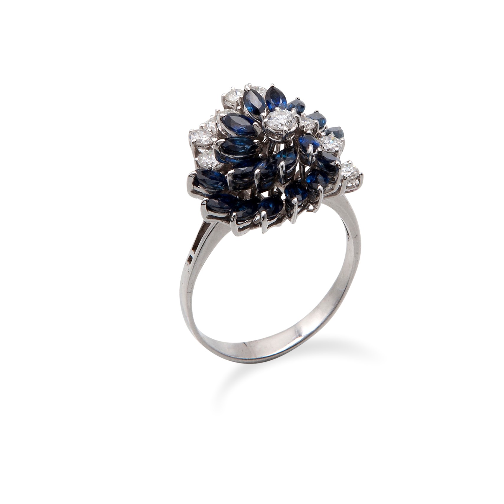 Oro bianco 750/000, zaffiri in taglio navette, brillanti ct. 1,00 circa prob. G - VVS.