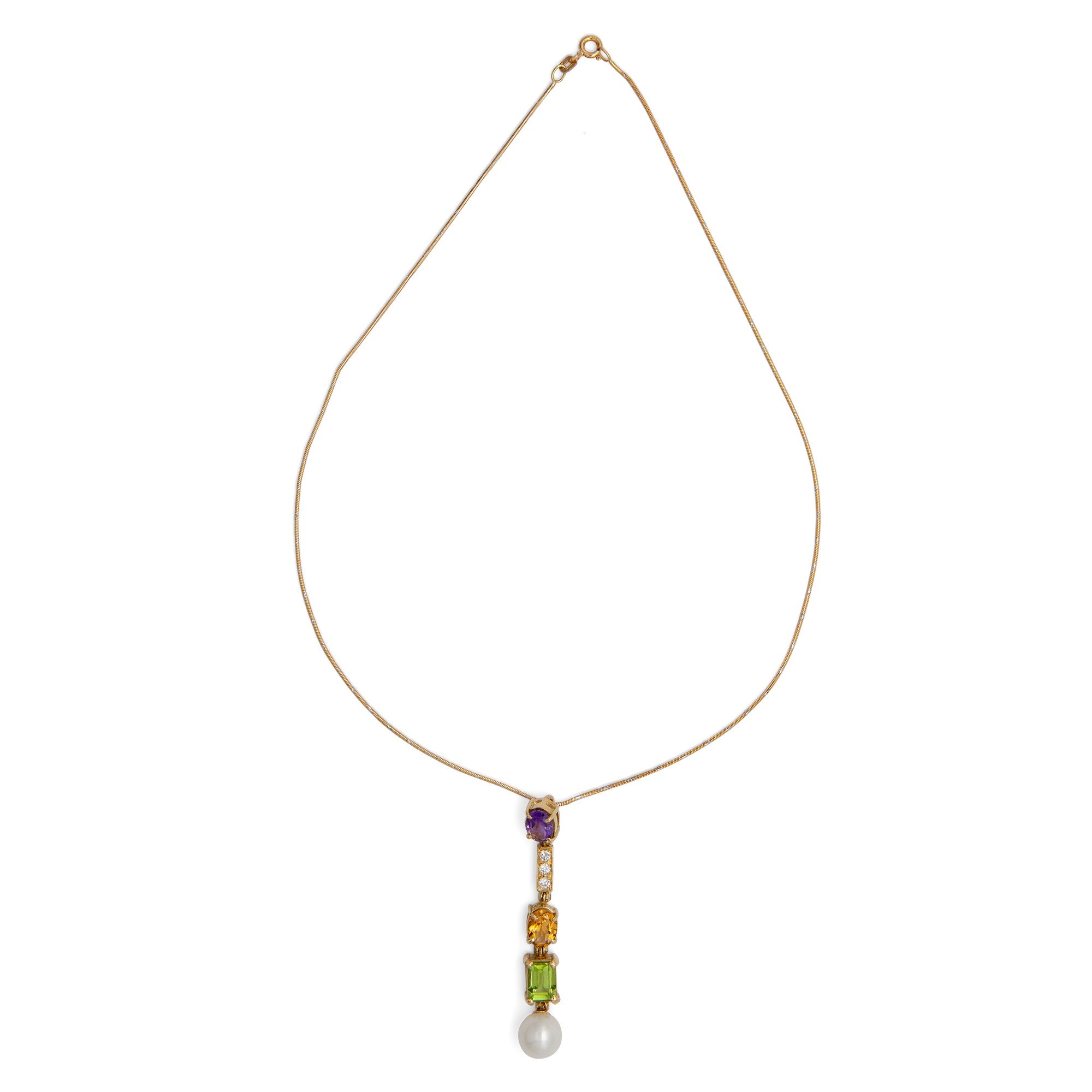 Collana con pendente in oro, perla , topazio, ametista, peridoto e brillanti
