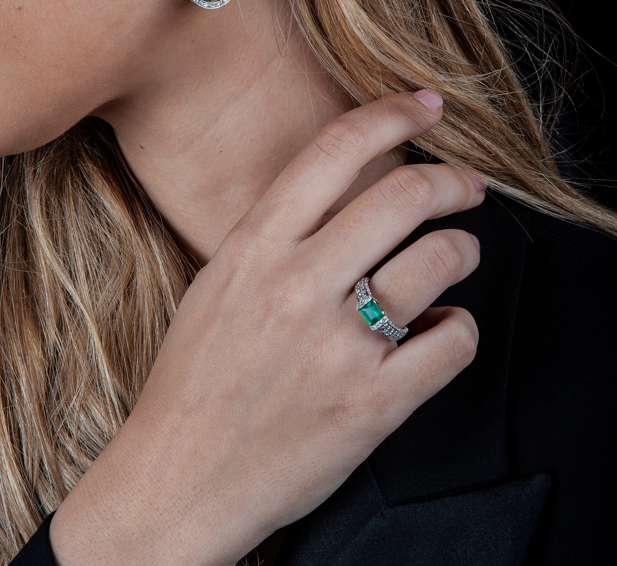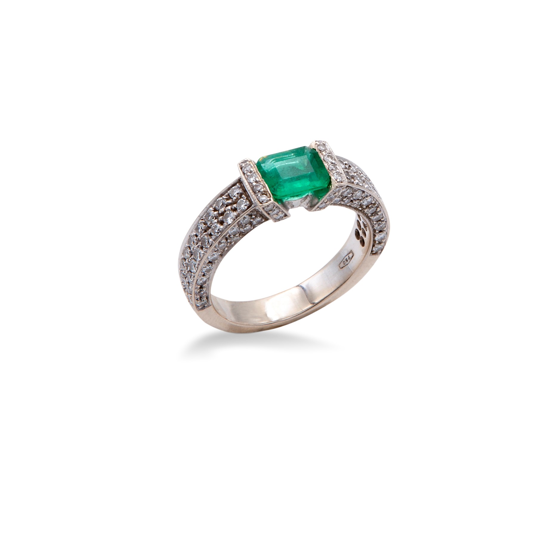 Oro bianco 750/000, brillanti ct. 1,10 ca, smeraldo colombiano centrale ct. 0,80 ca. Peso complessivo gr 6,90.