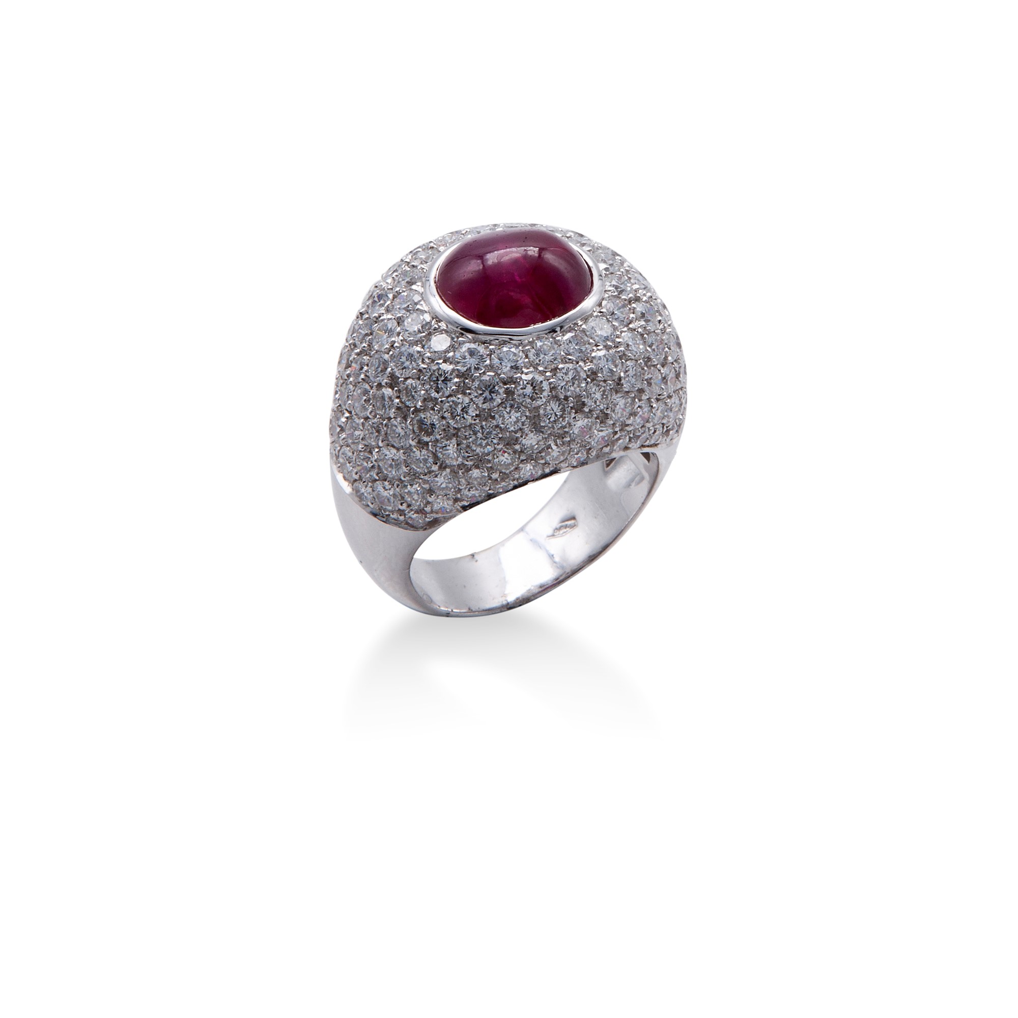 Oro bianco 750/000, rubino naturale in taglio cabochon ct 4,50 ca. Brillanti in taglio rotondo ct. 6,50 ca. prob H-I, VS-SI. Peso complessivo gr 20,60.