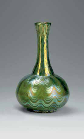 Loetz . Vaso in vetro iridato con un decoro a righe ondulate, 1900 circa. Firma incisa. altezza cm 21