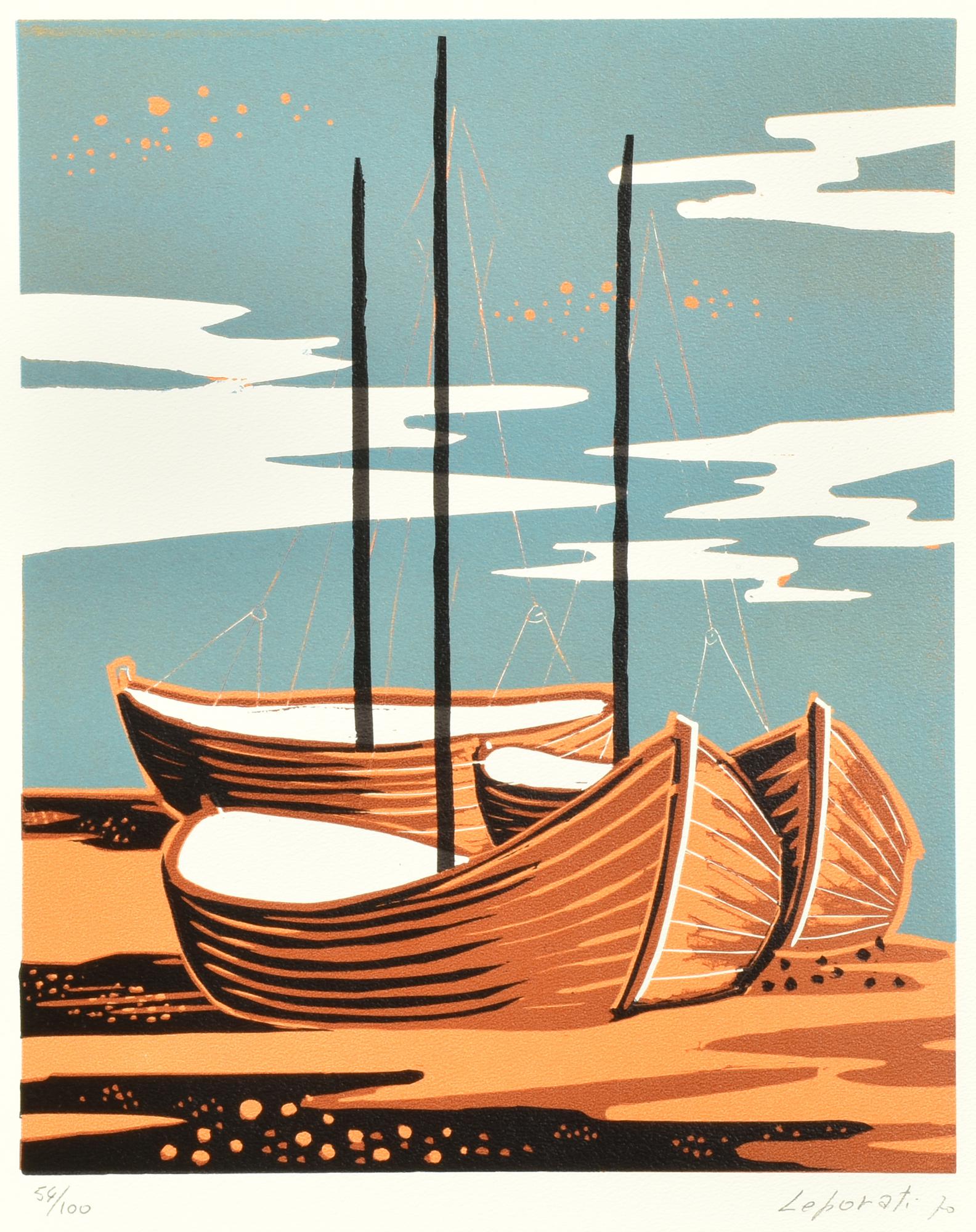 Leporati BARCHE incisione su carta, cm 33,5x26; es. 54/100 firma e data...