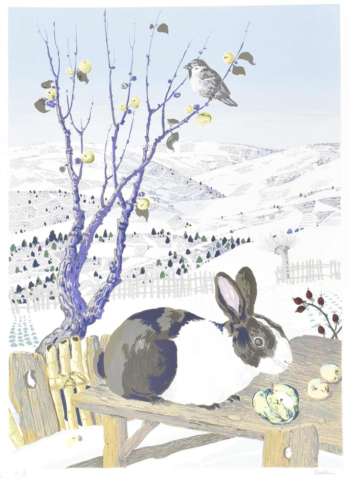 Enzo Bellini IL CONIGLIO E IL PASSERO serigrafia su carta, cm 70x50; es. P.A....