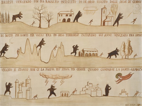Dino Buzzati "Ex voto, L'orso inseguitore" 1970 acrilico e tecnica mista su tela