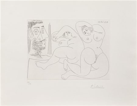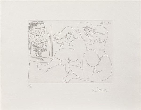 Pablo Picasso "Deux grosses femmes nues et un voyeur" 1968 acquaforte foglio cm
