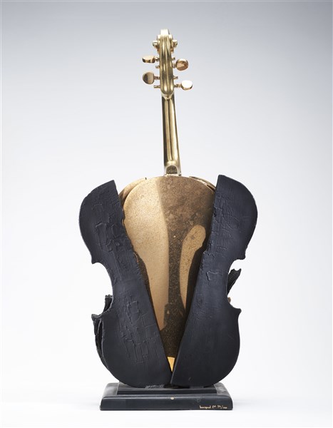 combustione di violino che racchiude un violino; bronzo dorato e patinato nero