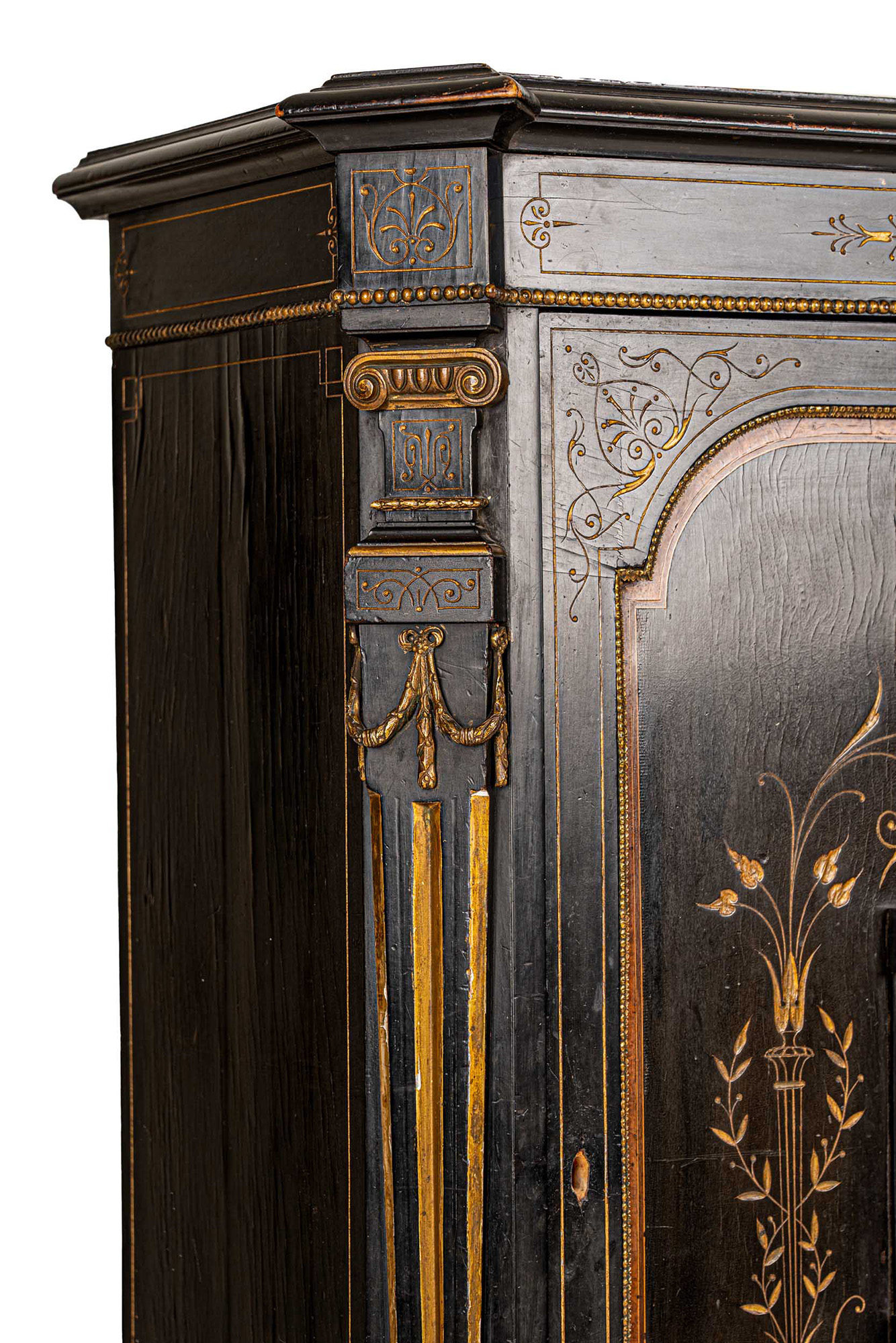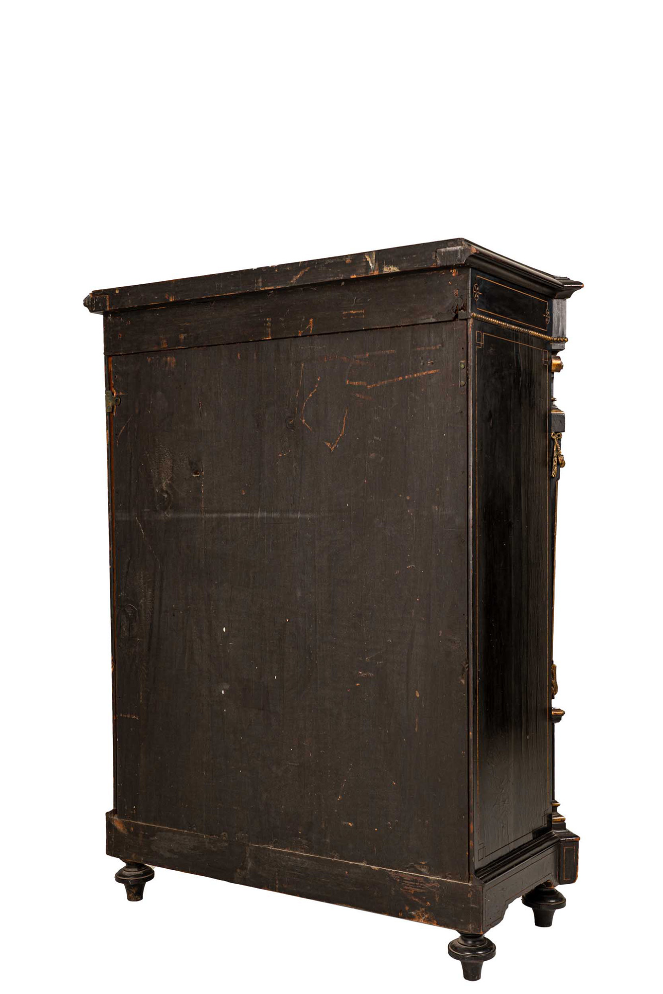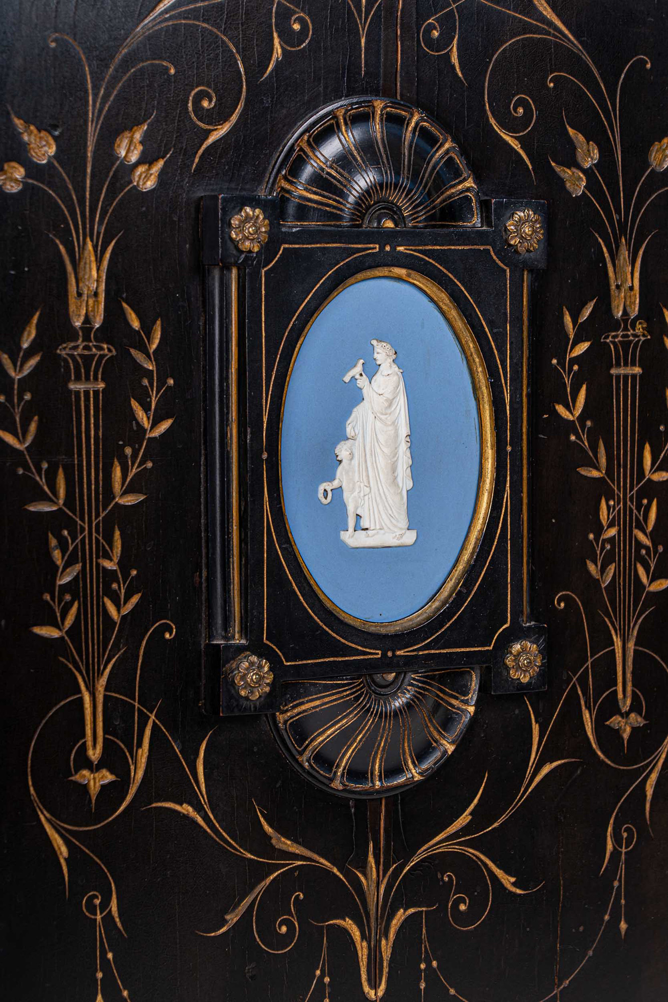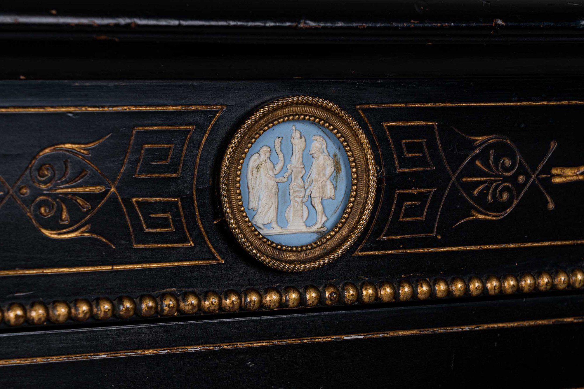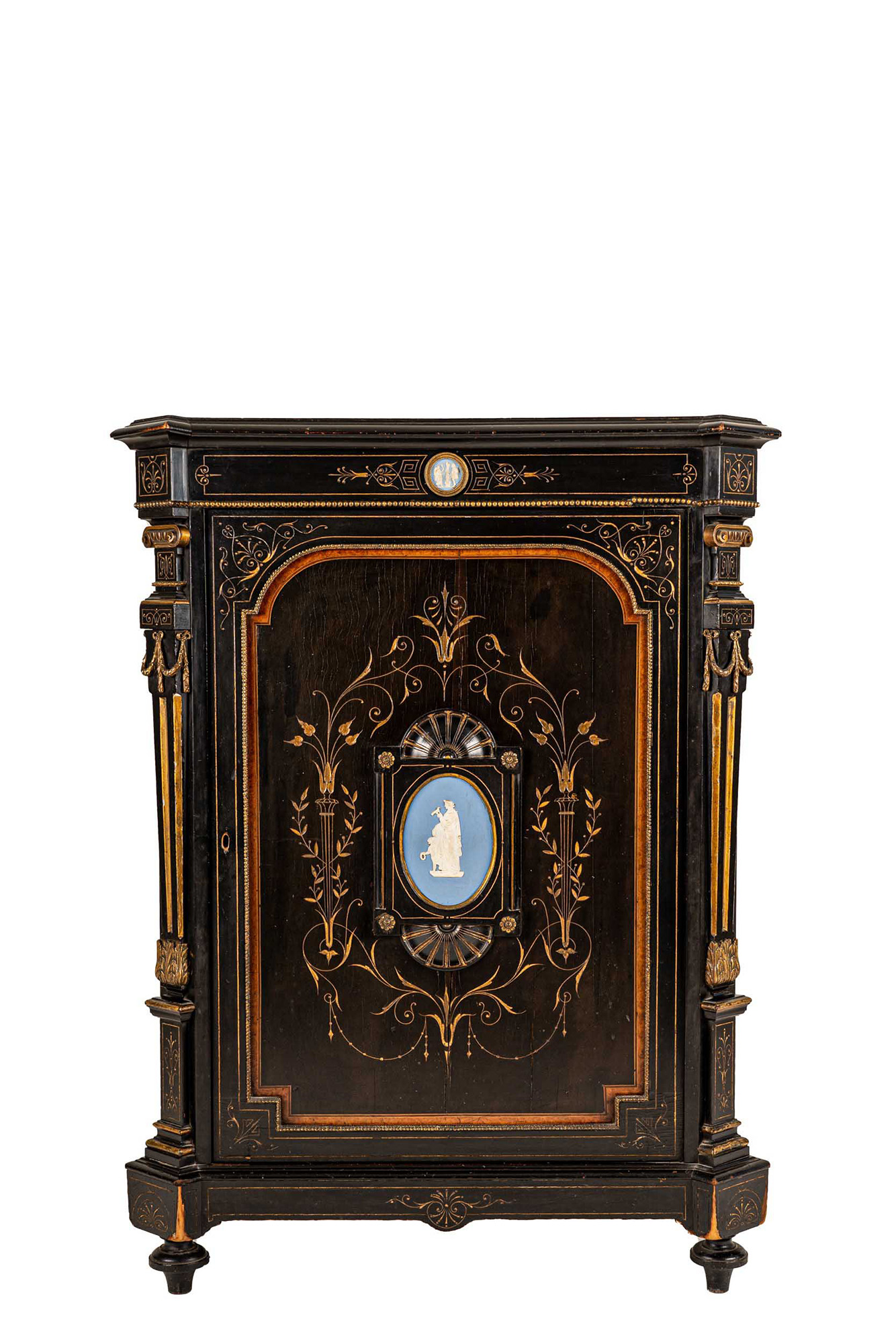 in legno ebanizzato, intagliato e dorato, decorato con placche di Sèvres in bisquit azzurro e bianco con soggetti classici. Piano sagomato, fronte ad uno sportello, angoli scantonati con lesene e rapporti in bronzo dorato, base modanata, piedi a cipolla