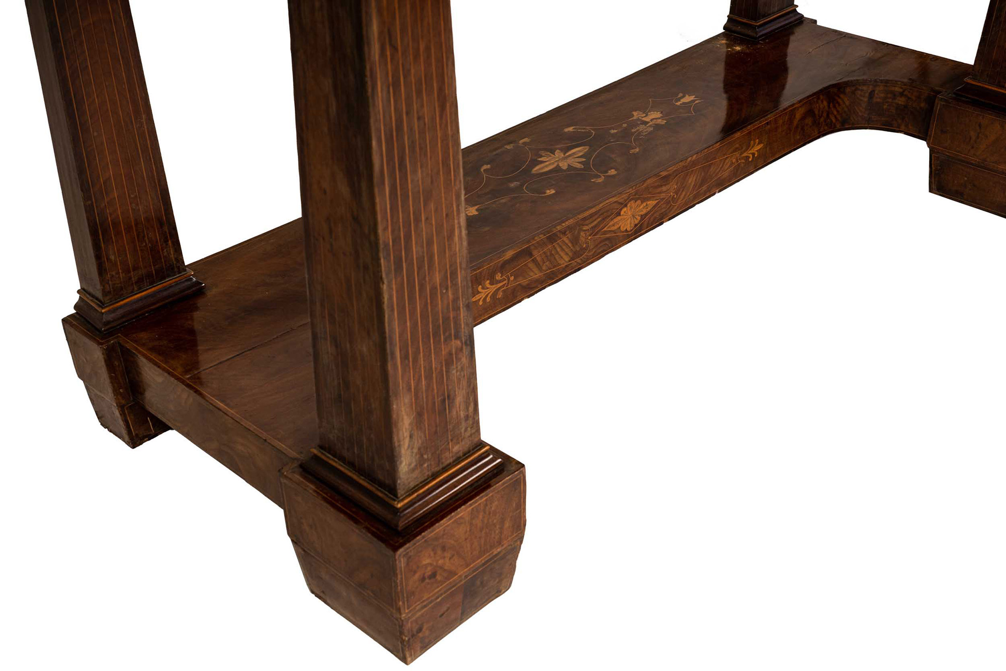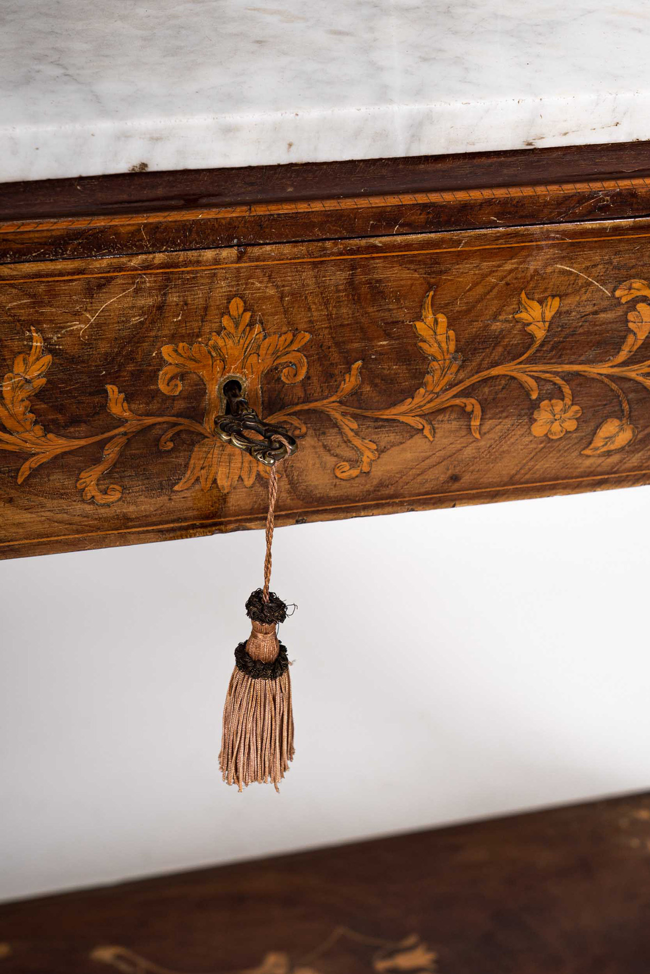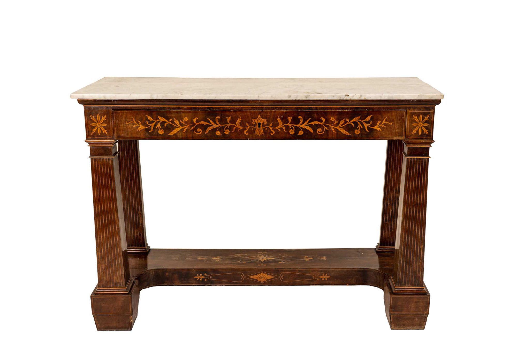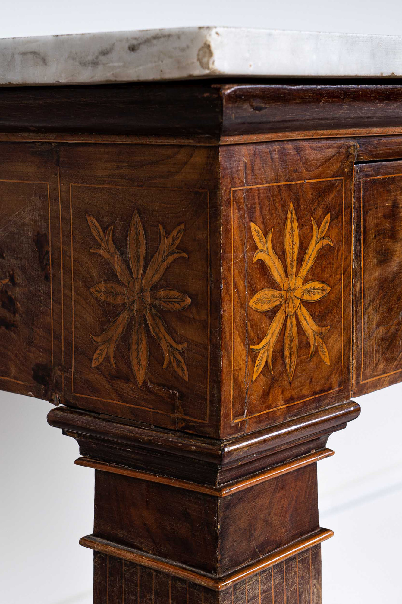 in mogano intarsiato con piano in marmo bianco