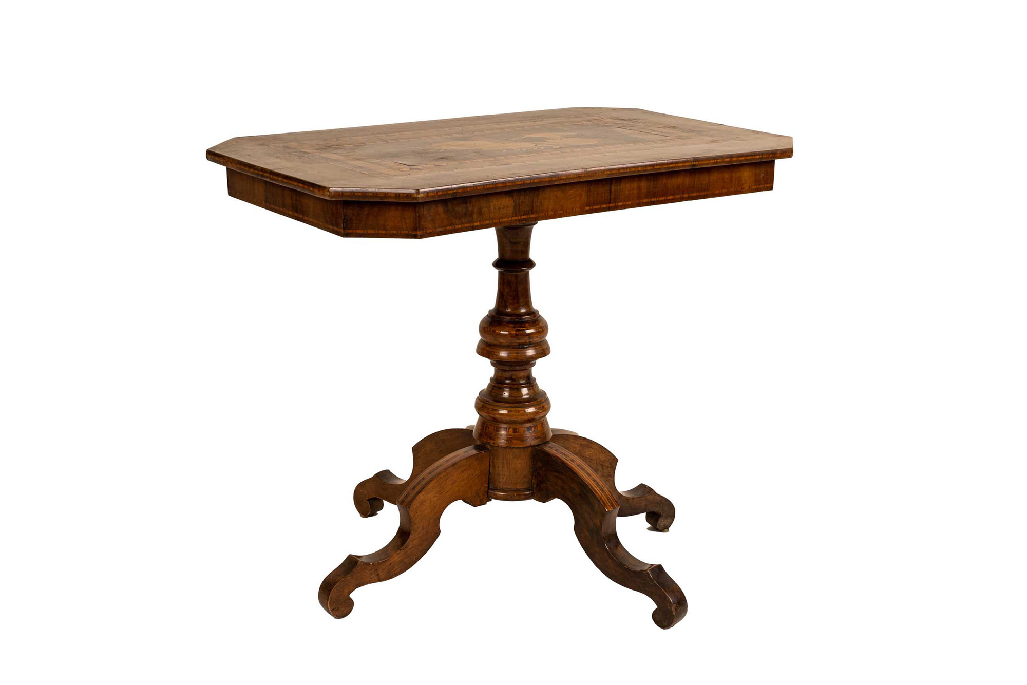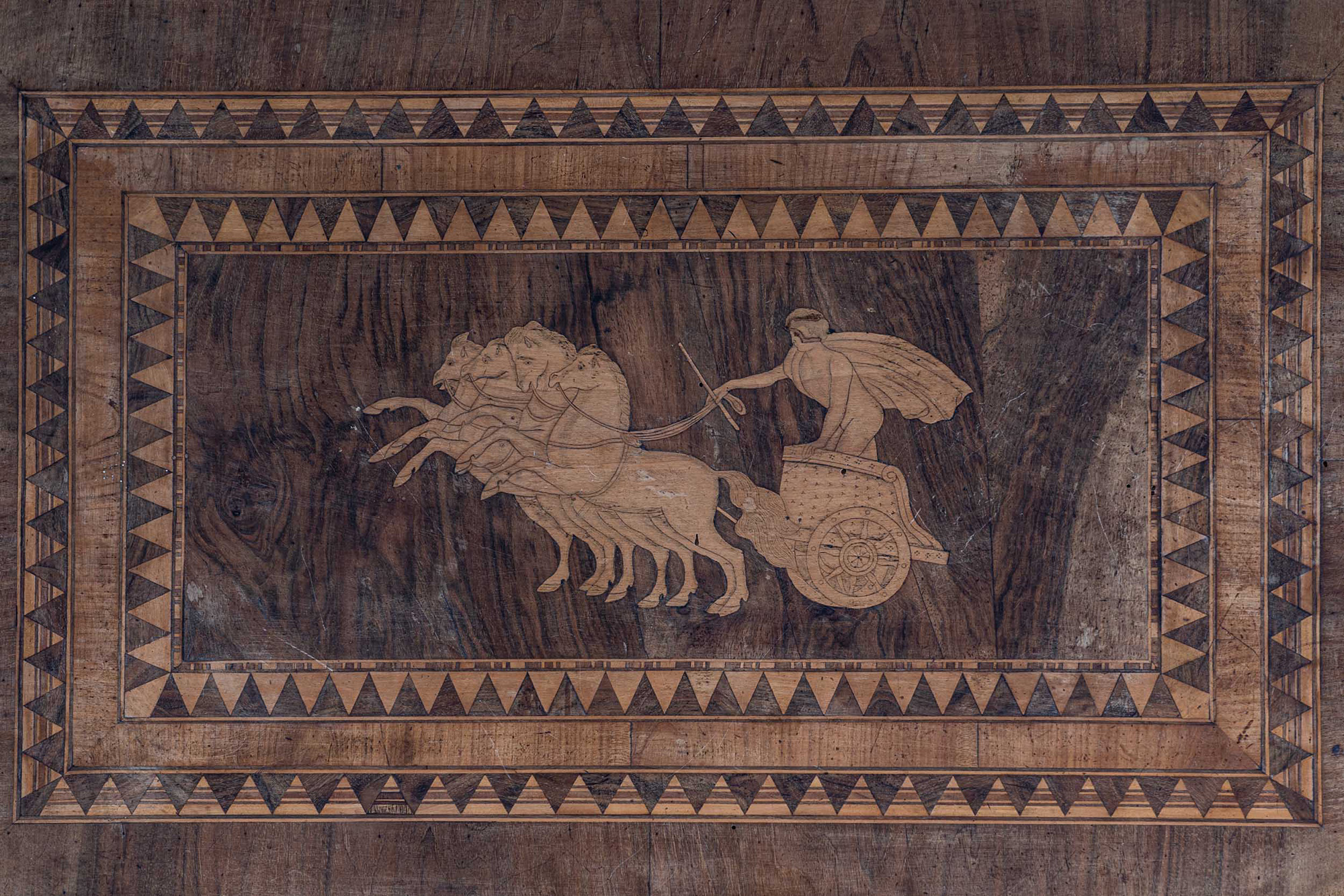 in noce intarsiato con olivo e legni di frutto, piano rettangolare con angoli scantonati, centrato da quadriga lanciata al galoppo con un giovane, probabilmente Apollo,col solo mantello sulle spalle che li sferza con la frusta.