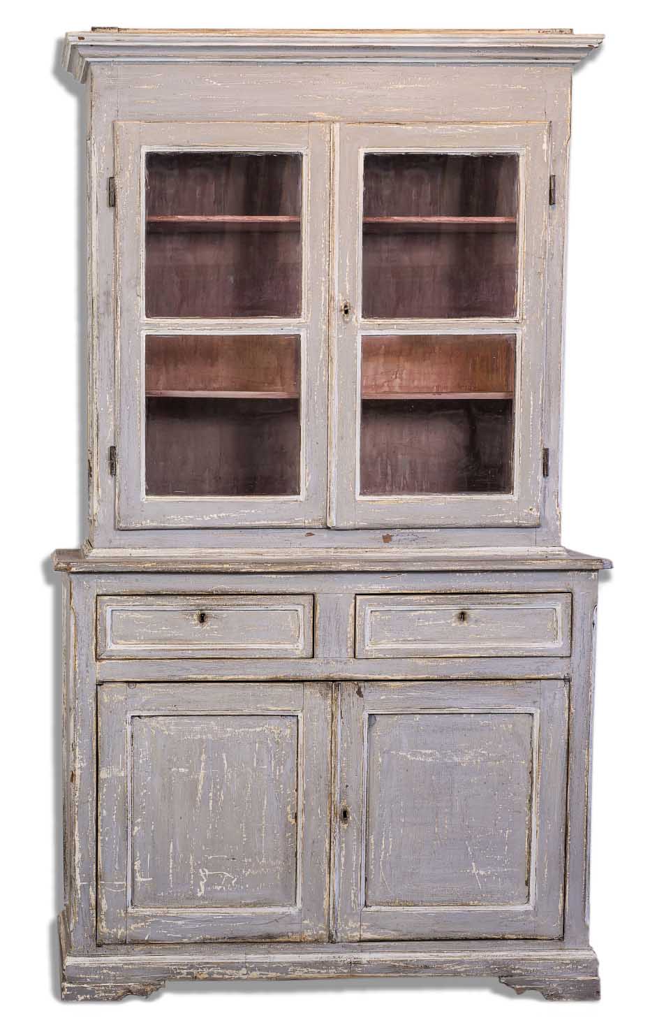 in legno laccato grigio, corpo superiore a vetrina, inferiore a due sportelli e due cassetti, base modanata