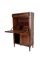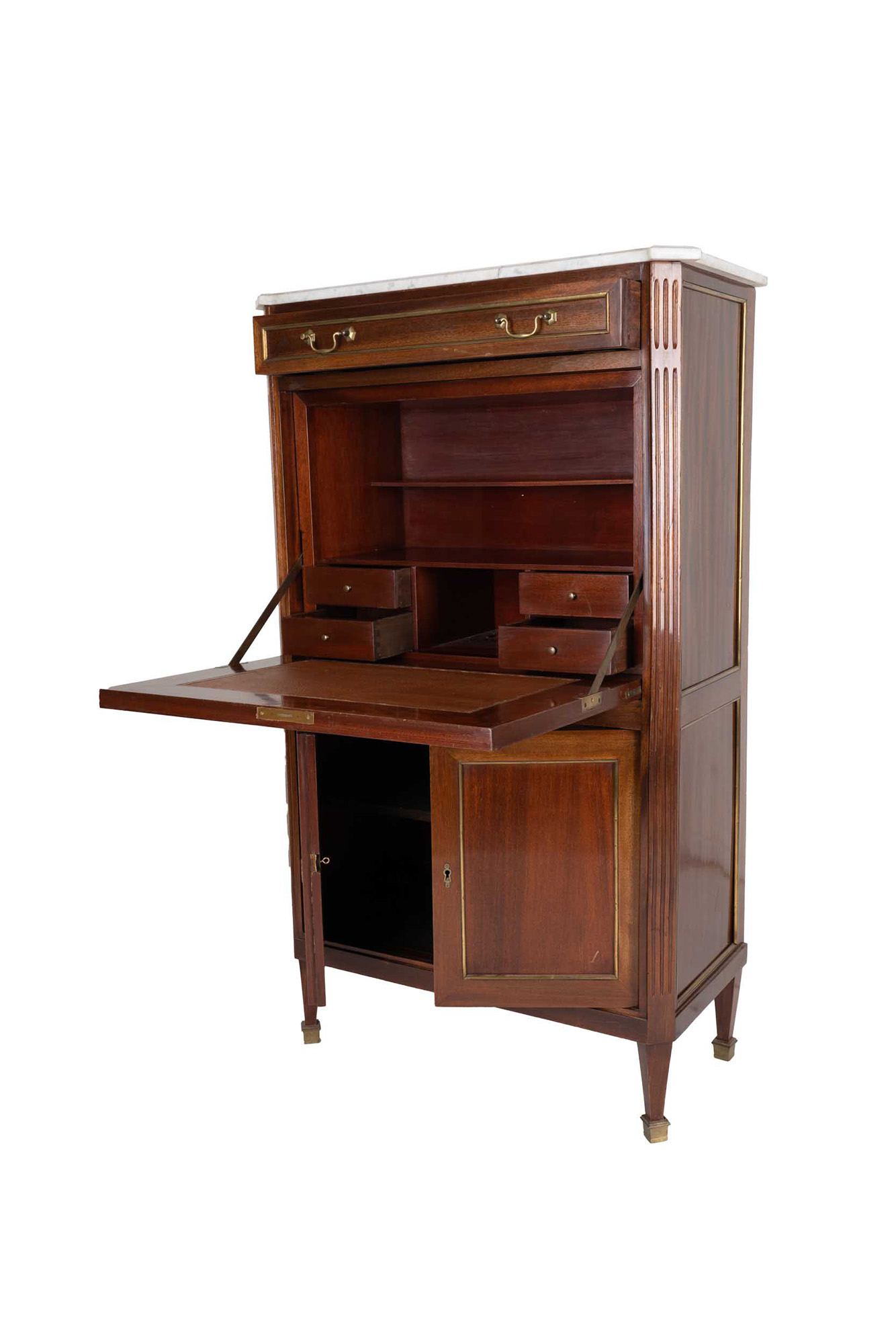 in mogano, piano sagomato in marmo bianco, un cassetto nella fascia, sportello a calatoia, con piano scrittoio in pelle, scarabattolo con cassetti e vani a giorno, due sportelli sottostanti, gambe troncopiramidali