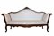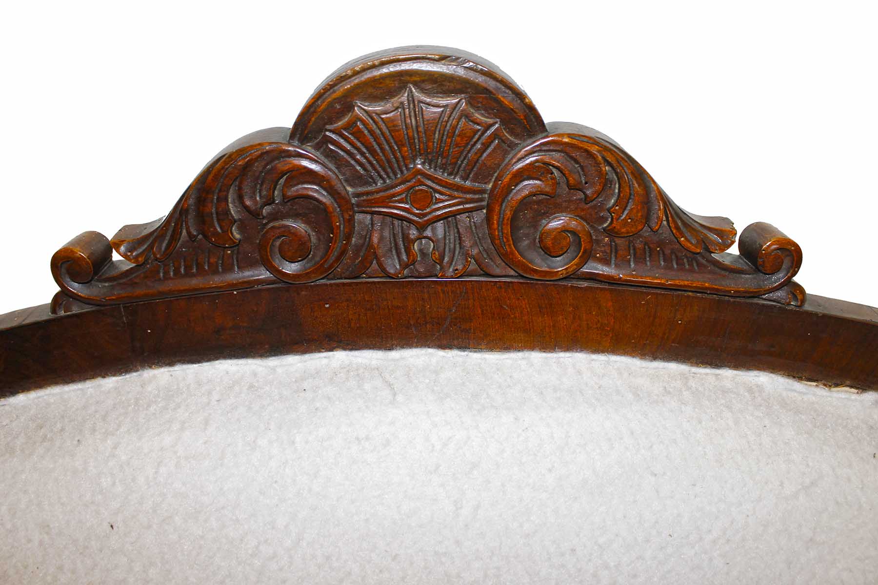 in noce intagliato, spalliera sagomata centrata da volute contrapposte, braccioli a ventaglio, gambe mosse schienale imbottiti, gambe mosse, senza tappezzeria, lievi difetti