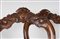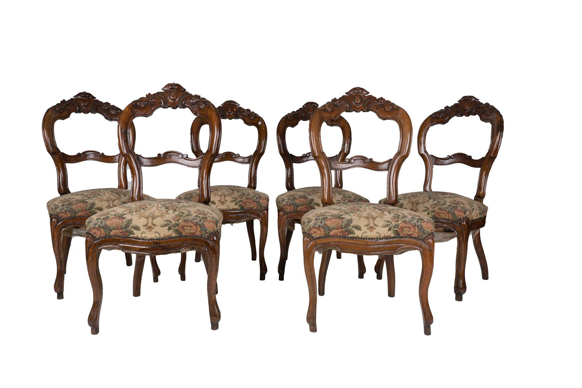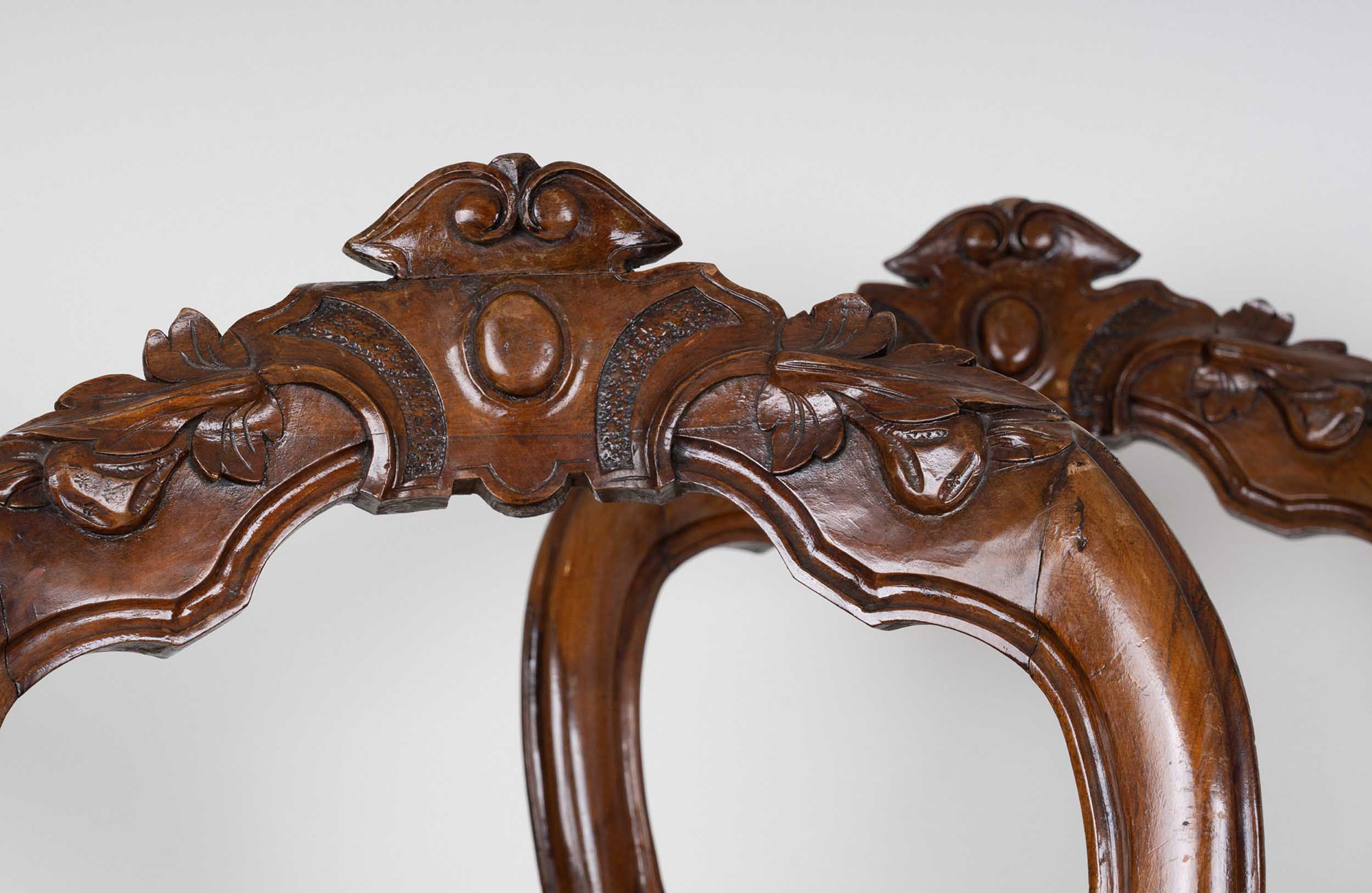 in noce intagliato, spalliera sagomata e decorata da motivi fitomorfi, sedile rivestito in cotone operato a fiori, gambe sinuose