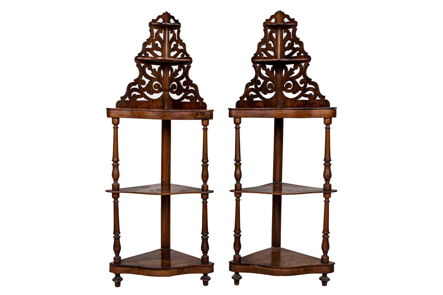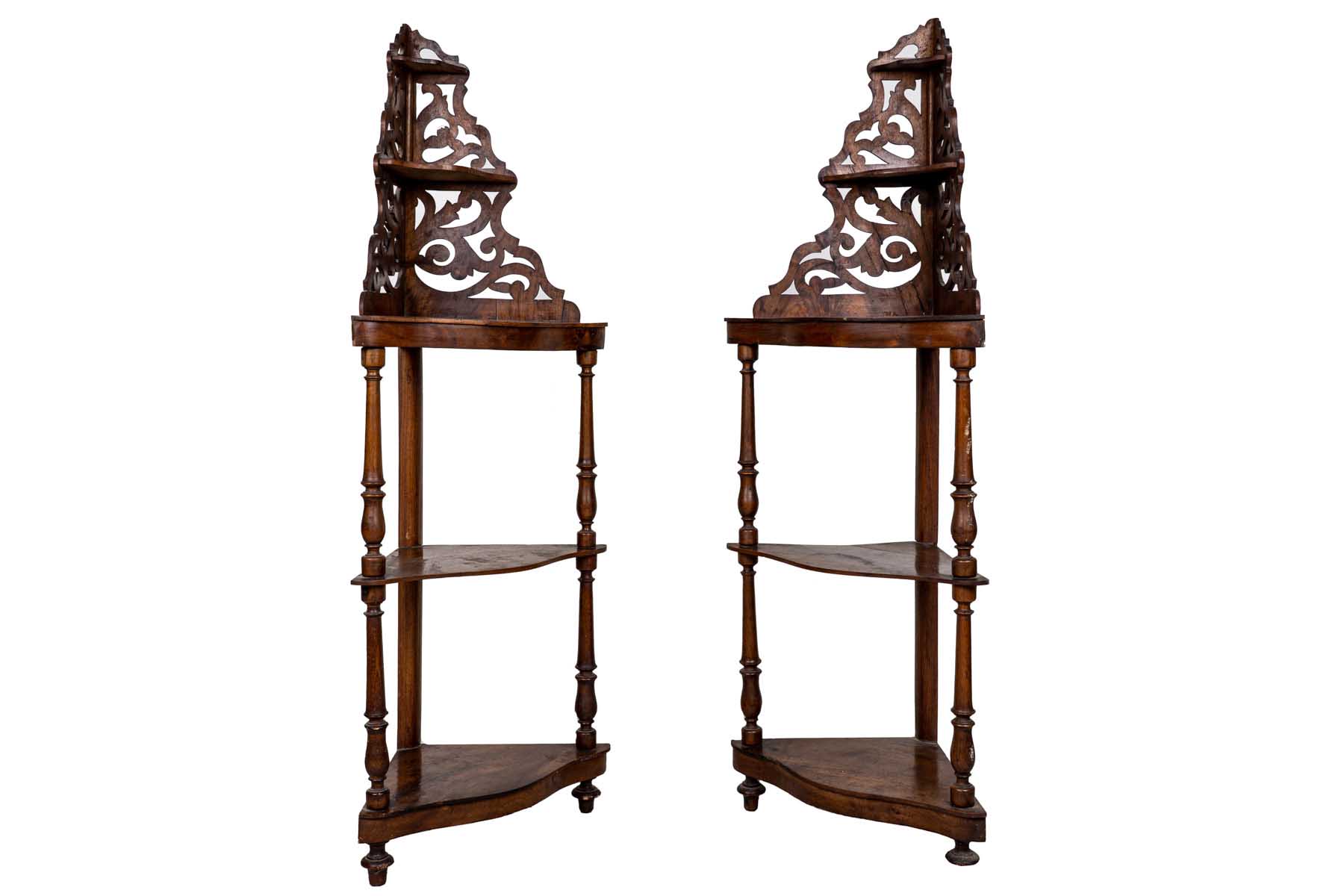in noce tornito e traforato a tre ripiani, con alzatina soprastante traforata a volute vegetali