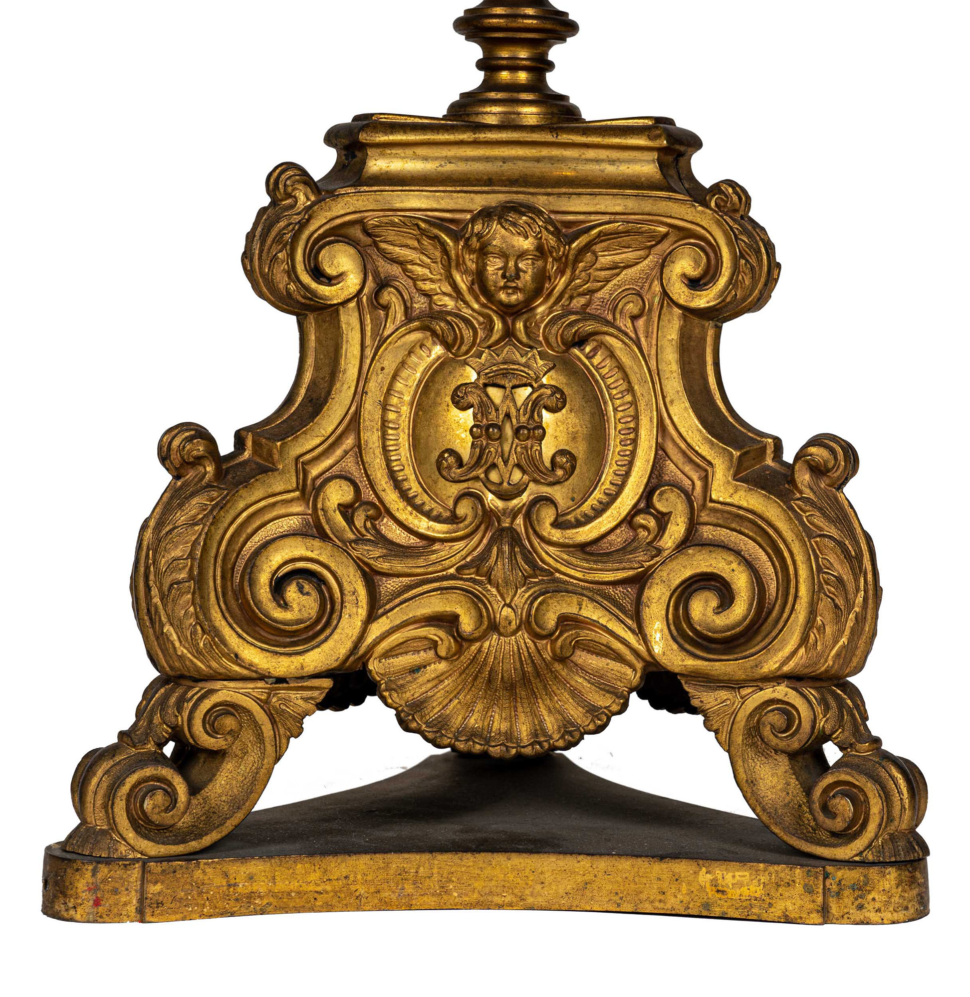 in bronzo dorato, fusto a balaustro scannellato decorato a motivi fogliacei, cinque bracci portacandela su tre ordini, base tripode con piedi a voluta decorati con conchiglie e cherubini in altorilievo