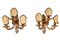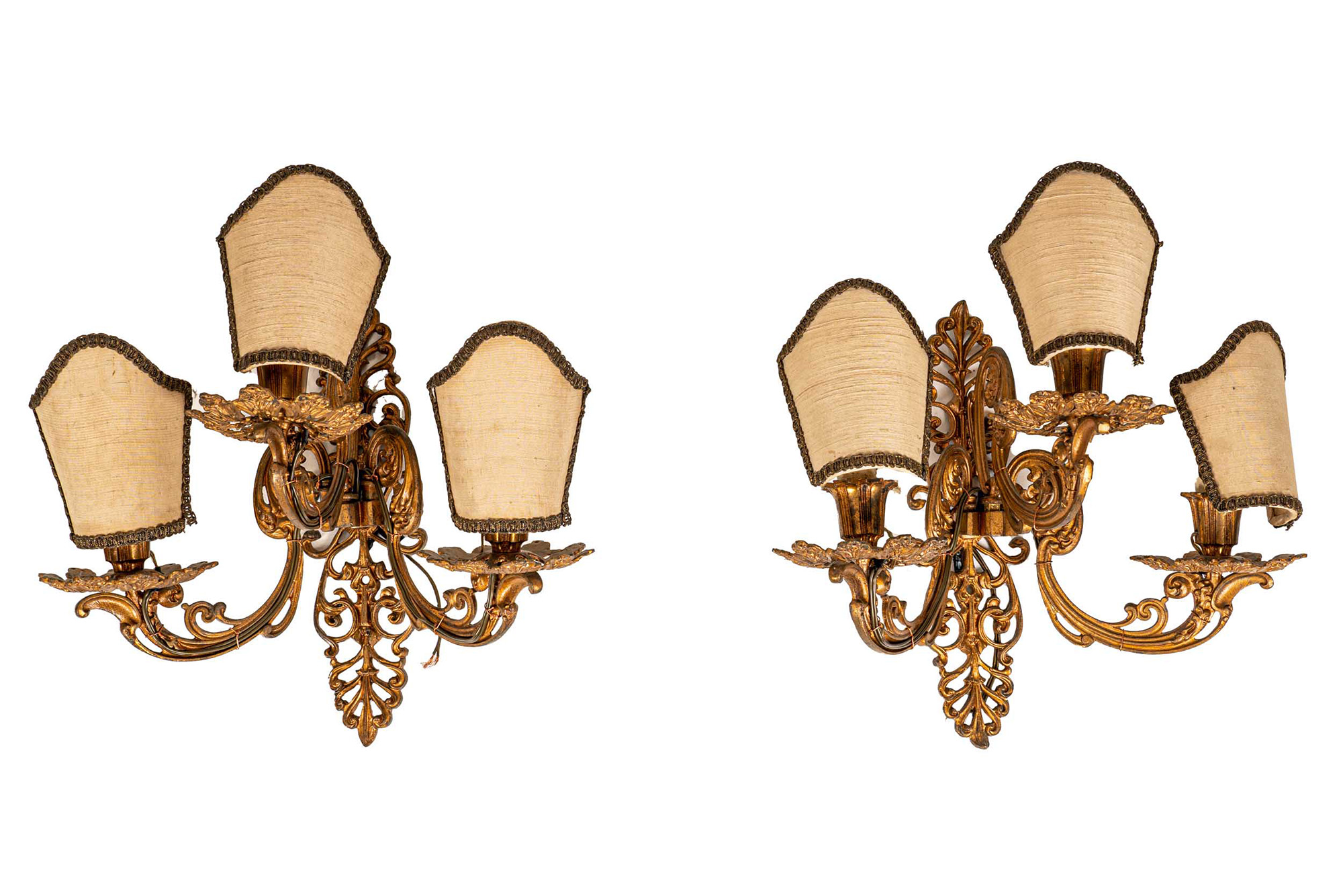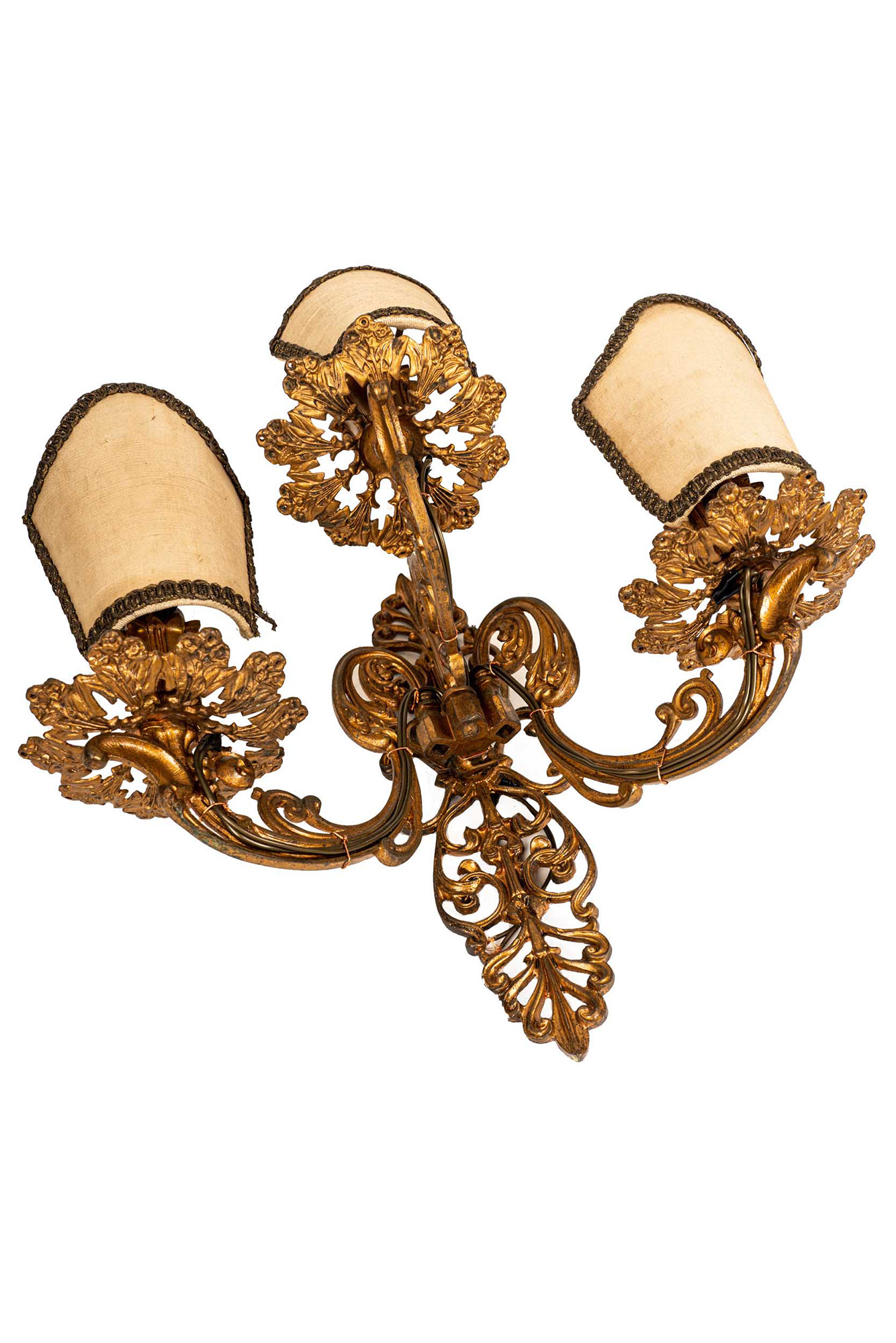 Lampadario in metallo brunito a sei braccia modellate a volute vegetali, coppia di appliques in metallo dorato a tre braccia modellate a volute vegetali