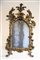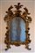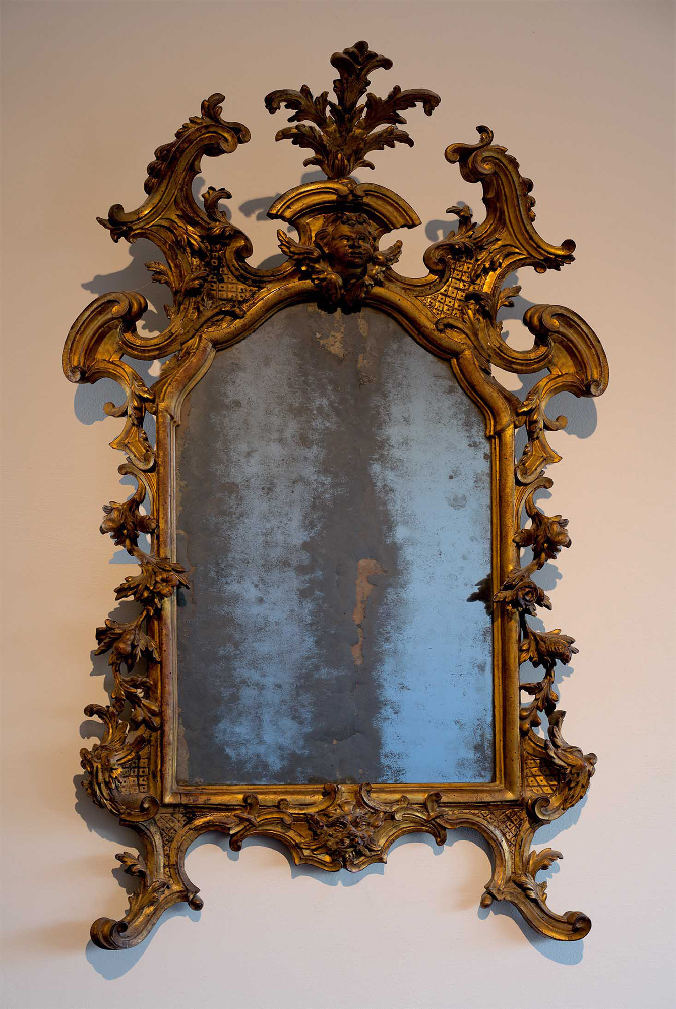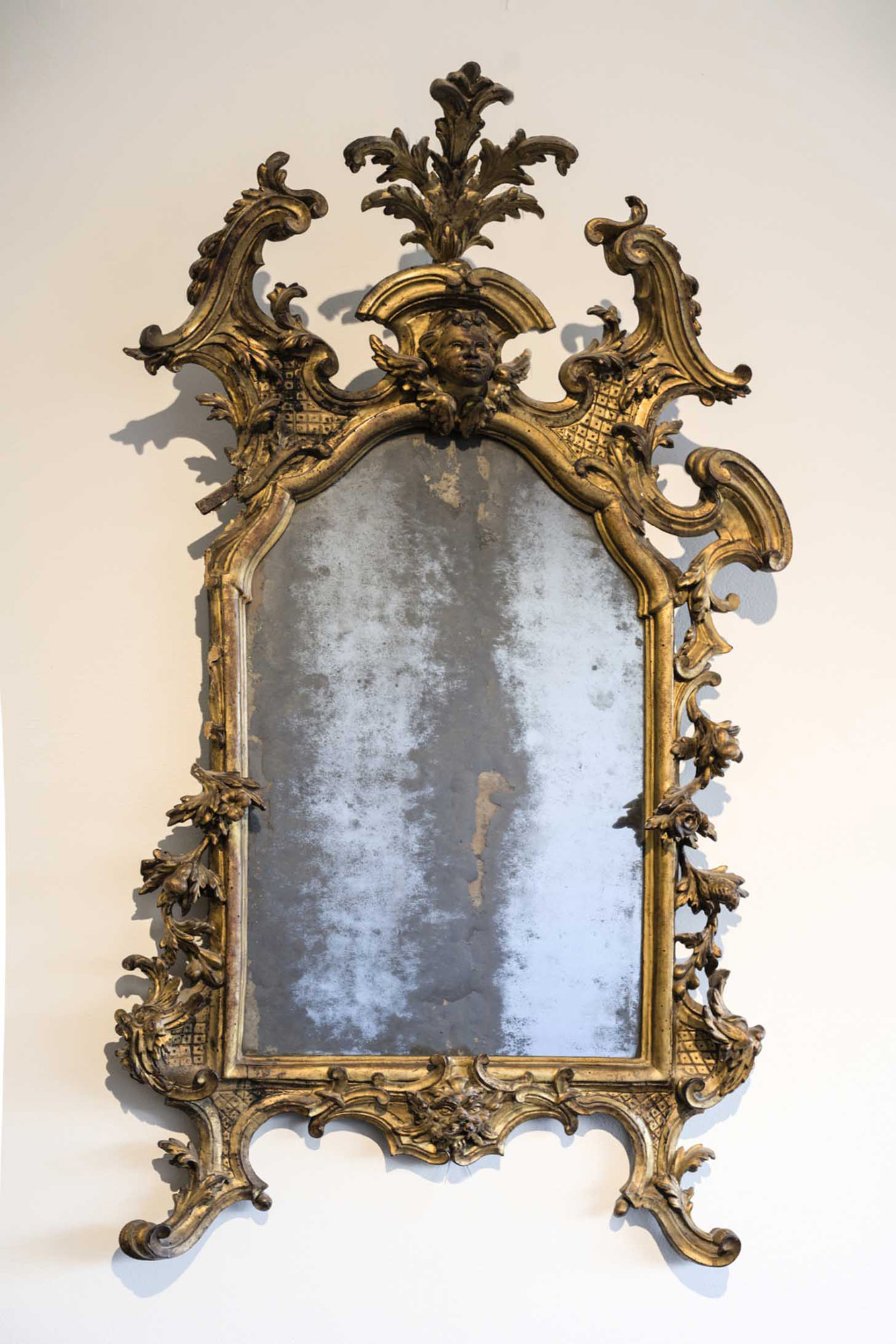 in legno riccamente intagliato e dorato; cimasa a timpano spezzato centrata da testa di putto alato scolpita a tutto tondo, fra volute vegetali ricadenti lungo i fianchi con racemi floreali, parte inferiore con gambe a volute contrapposte, pendaglina sagomata centrata da mascherone ferino; cornice interna modanata, specchio al mercurio originale