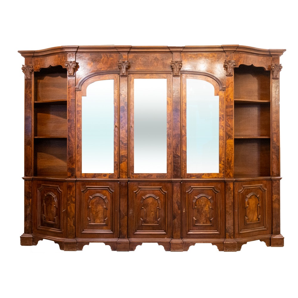 VETRINA in noce e radica di noce a tre ante, due ante a giorno laterali e cinque ante nella parte sottostante.