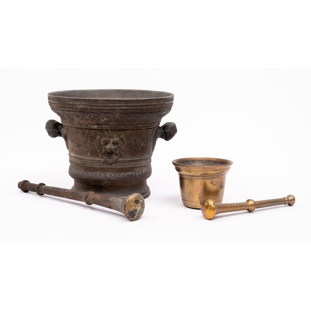 in bronzo di cui uno lavorato a teste di mascherone e ghirlande con anse a guisa di putto.