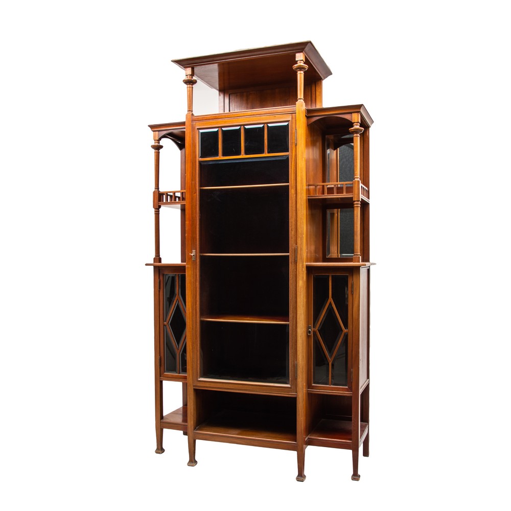 MOBILE/VETRINA Liberty con etagere laterali in legno di mogano.