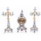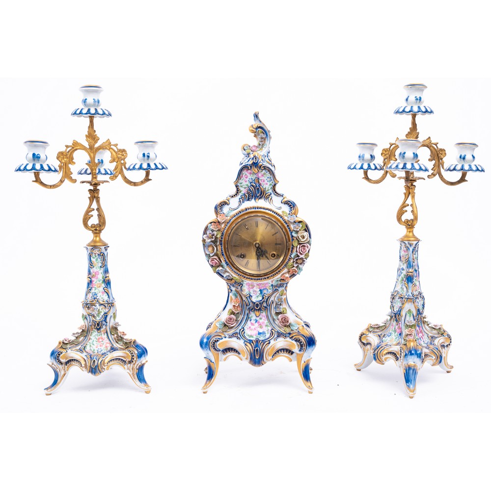 Orologio e coppia di candelabri a quattro fiamme in porcellana dipinta.