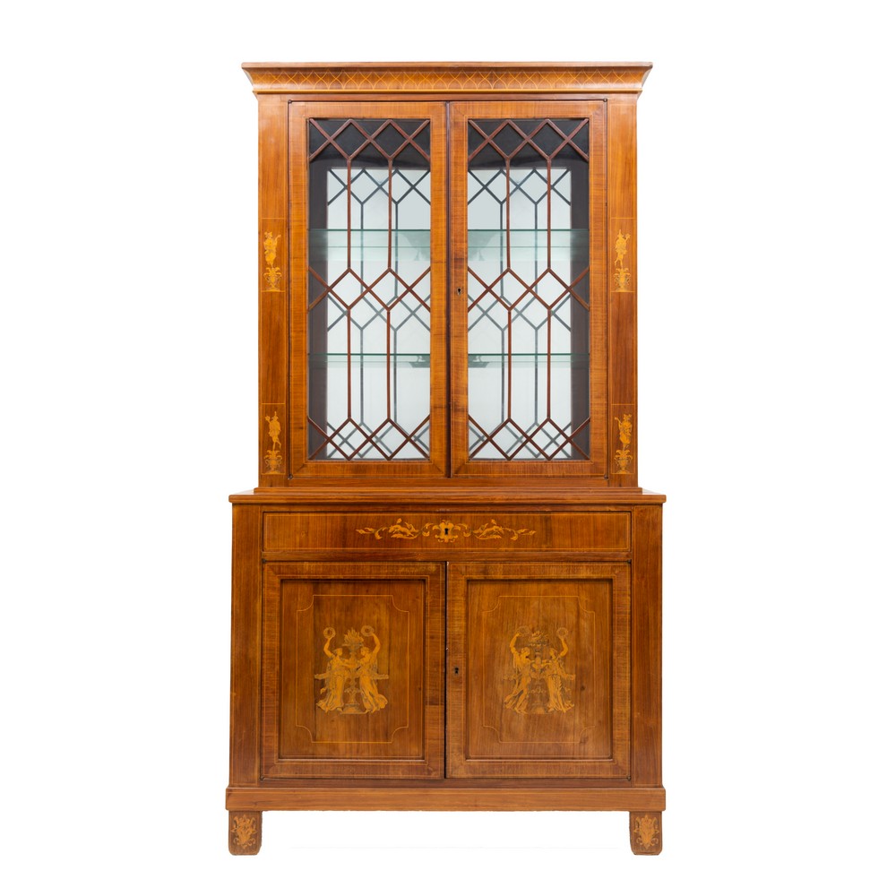 CREDENZA con alzata stile Carlo X a due ante nella parte sovrastante in noce, tarsie in bosso.