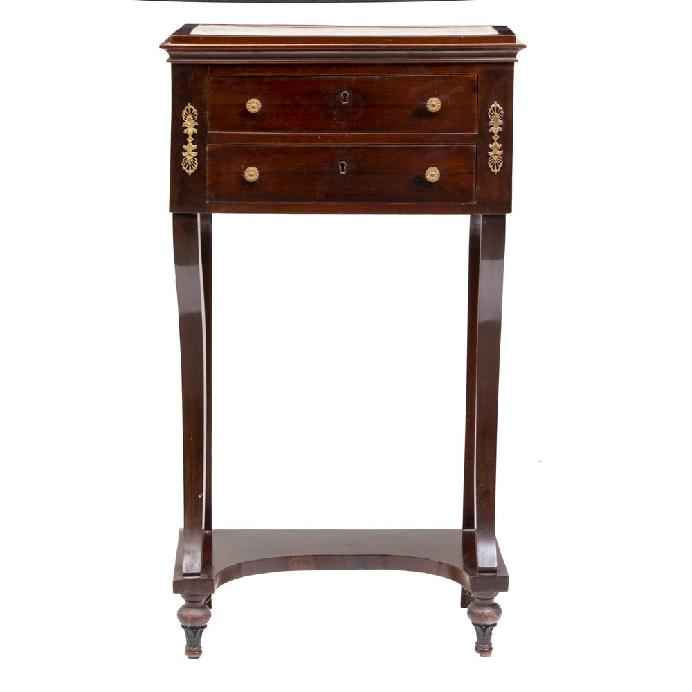 CONSOLLE Impero con due cassetti in mogano e piuma di mogano, piano in marmo bianco incassato.