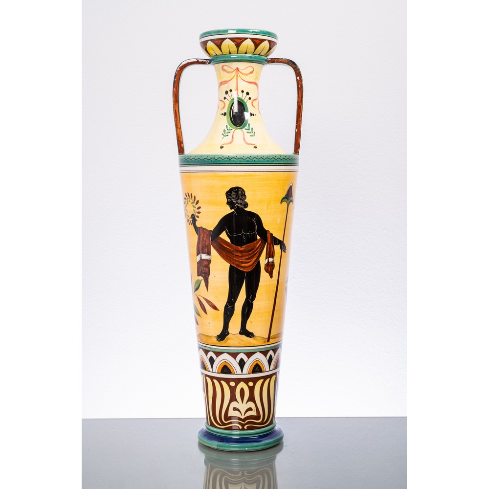 Vaso con anse in ceramica smaltata e decorata raffigurante 'Scena neoclassica', marchio alla base.
