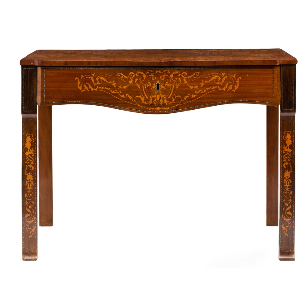 con cassetto centrale in legno di mogano e piuma di mogano, tarsie in bosso.