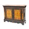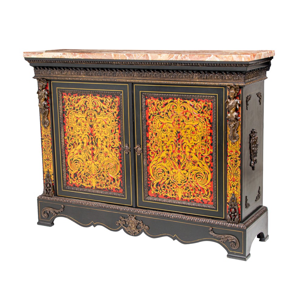CREDENZA STILE BOULLE in legno ebanizzato con tarsie in rame ed elementi in bronzo, piano in marmo rosso venato.