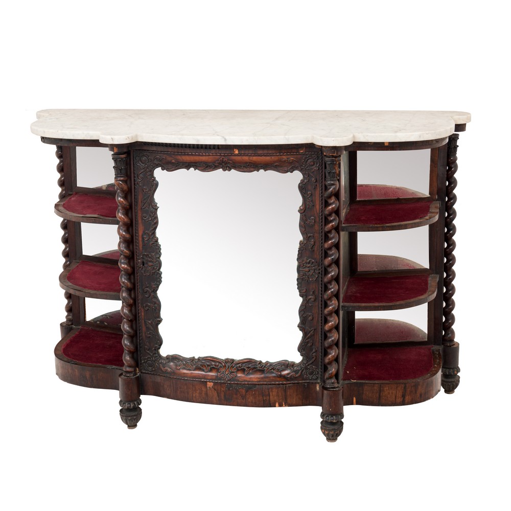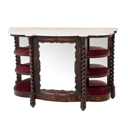 Etagere Luigi Filippo in legno di palissandro con due vani laterali a giorno, sportello centrale intagliato con specchio, piano in marmo bianco di Carrara.