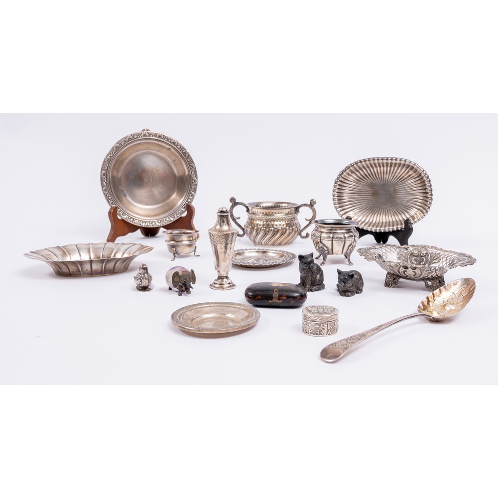 Tre svuotatasche, due piattini, un cucchiaio, due saliere, piccolo cestino, un portapillole, una zuccheriera, e uno spargisale in argento, quattro animali in argento e pietre dure e un portamonete (g. 850).