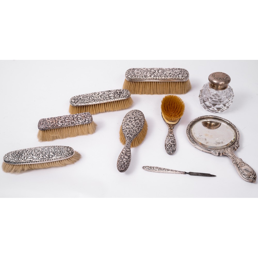 in argento composto da sei spazzole, specchio, bottiglietta e lima.