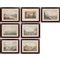 SETTE STAMPE a colori raffiguranti "Scorci di città" entro cornici in mogano (usure).