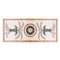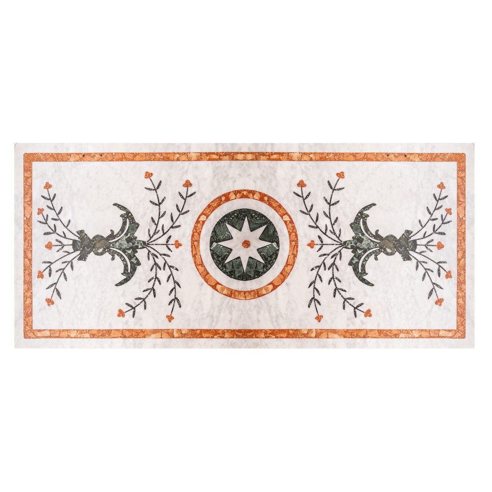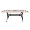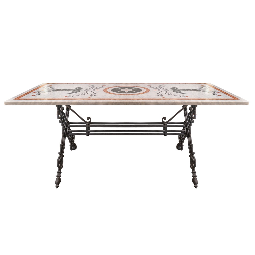 TAVOLO con piano in marmo intarsiato, base in ferro e ghisa