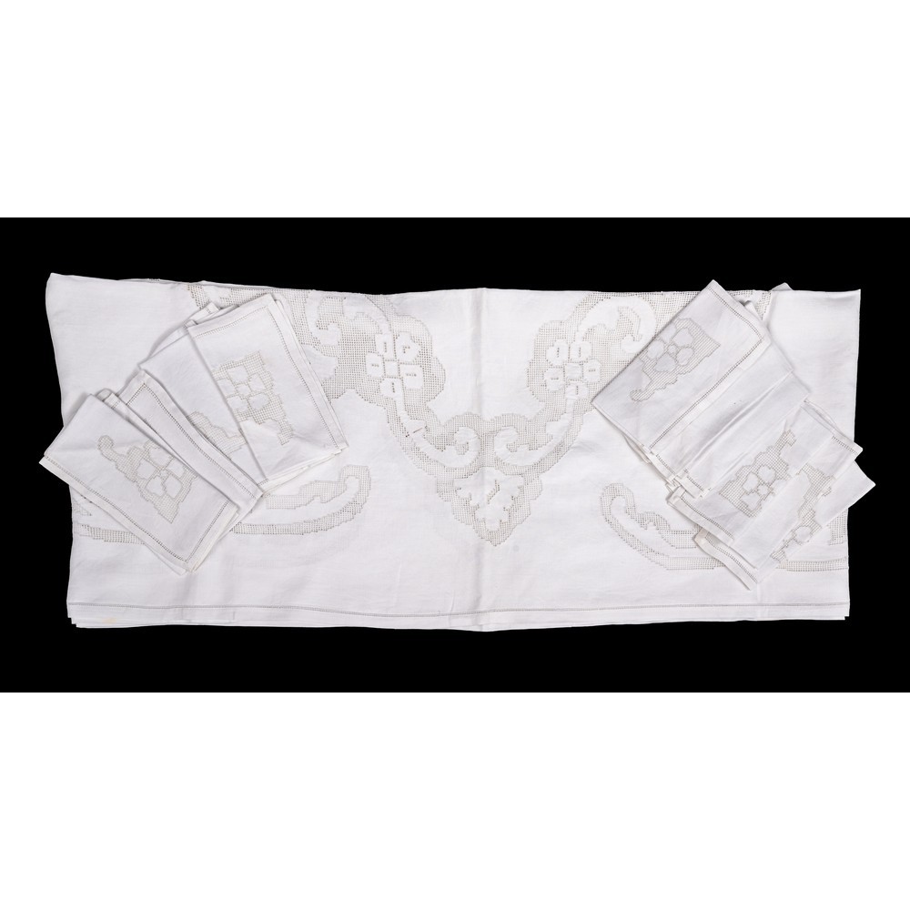 TOVAGLIA con dodici tovaglioli in lino dei toni del bianco, ricamato a mano.