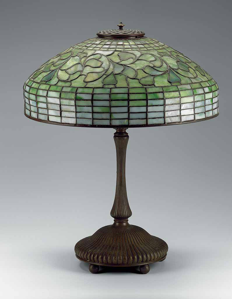 Tiffany. Lampada da tavolo, base in bronzo, diffusore in vetro a piombo con decoro di una fascia di foglie stilizzate, 1900 circa. Firmata altezza cm 57