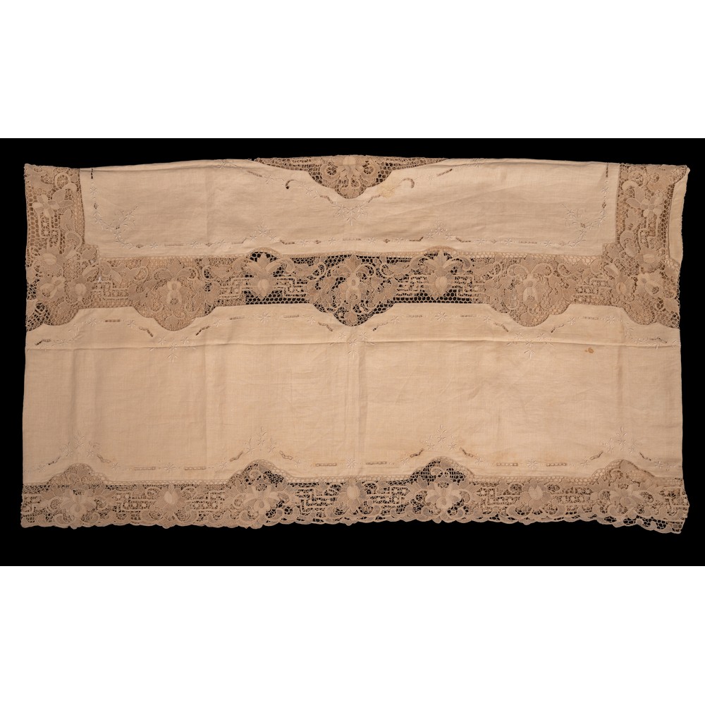 nei toni dell'écru ricamato a mano con applicazioni in pizzo Burano (macchie).