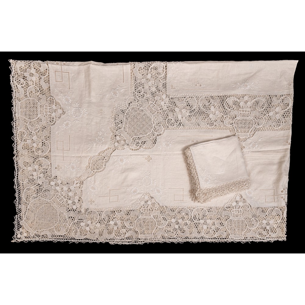 TOVAGLIA con dodici tovaglioli in lino nei toni dell' ecrù ricamato a mano con pizzo bianco.